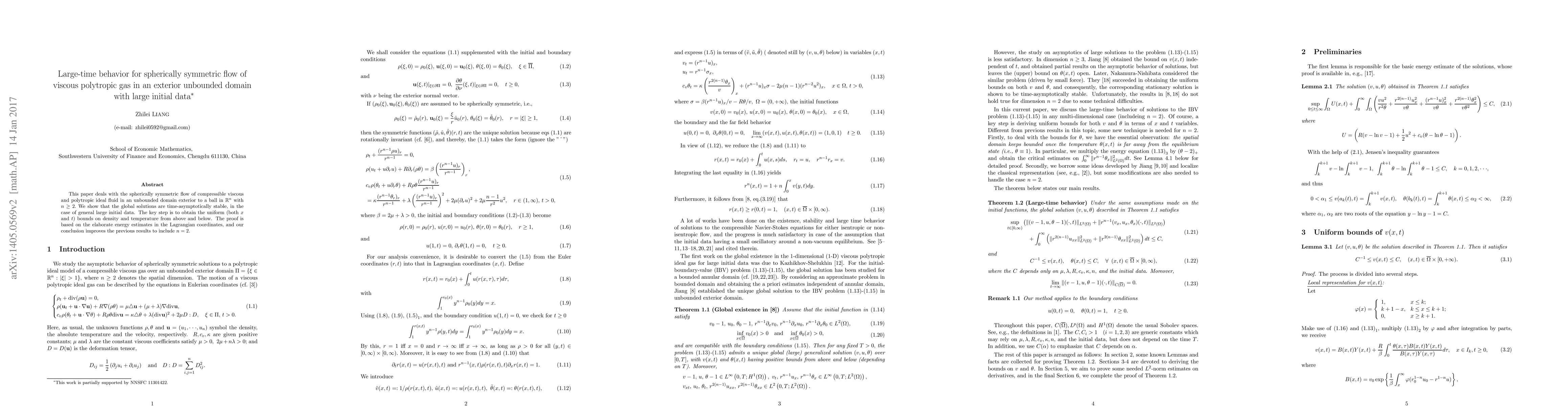 This paper deals with the spherically symmetric flow of compressible viscous and polytropic ideal fluid in unbounded domain exterior to a ball in $\mathbb{R}^n$ with $n\ge2$. We show that the global solutions are convergent as time goes to infinity. The critical step is obtaining the point-wise bound of the specific volume $v(x,t)$ and the absolute temperature $\theta(x,t)$ from up and below both for $x$ and $t$. Note that the initial data can be arbitrarily large and, compared with \cite{nn}, our method applies to the spatial dimension $n=2.$ The proof is based on the elementary energy methods.
