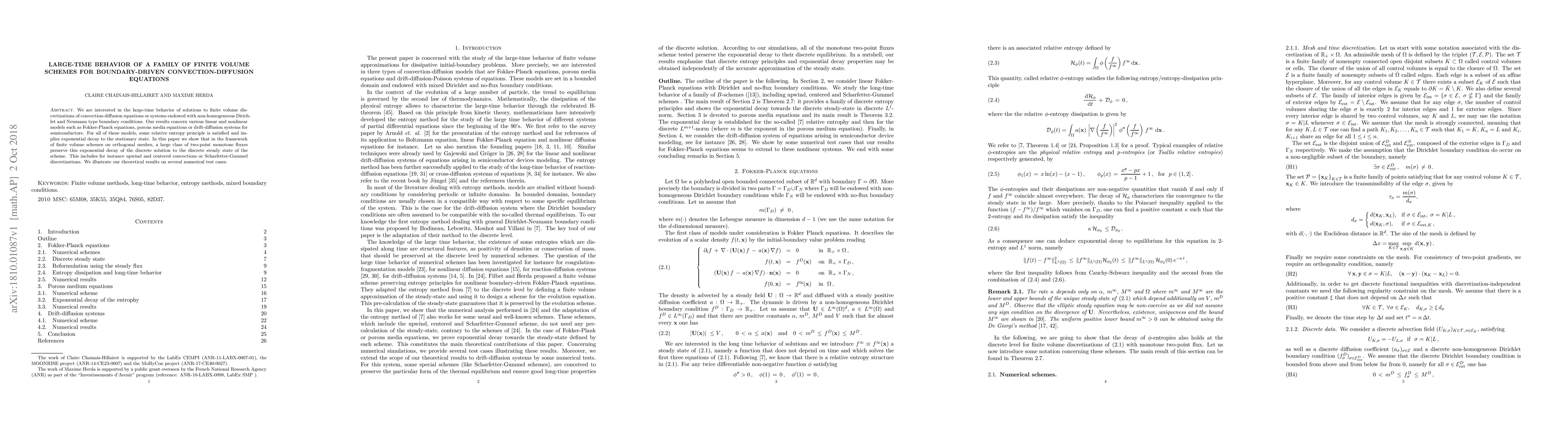This paper investigates the long-term behavior of finite volume schemes for convection-diffusion equations with boundary conditions, showing that a wide range of two-point monotone fluxes, including upwind and centered methods, preserve exponential decay to the steady state. The study is supported by numerical test cases for various models like Fokker-Planck and porous media equations.