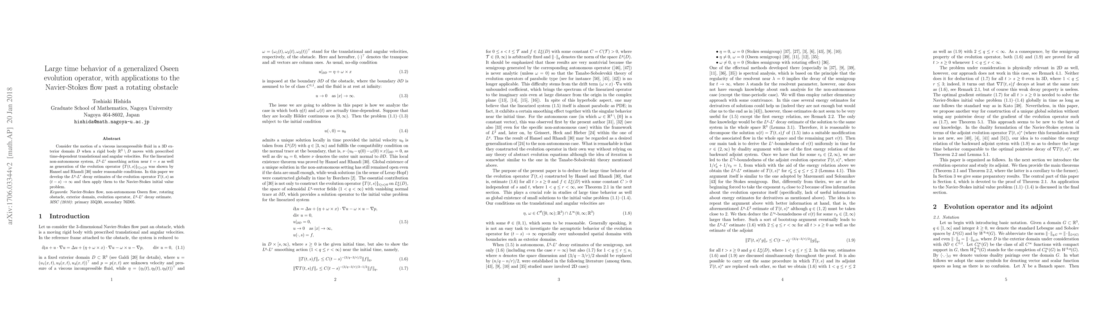 This paper investigates the long-term behavior of a generalized Oseen evolution operator for viscous incompressible fluid flow around a rotating obstacle. It establishes $L^q$-$L^r$ decay estimates for the evolution operator and applies these results to analyze the Navier-Stokes flow past a moving rigid body.