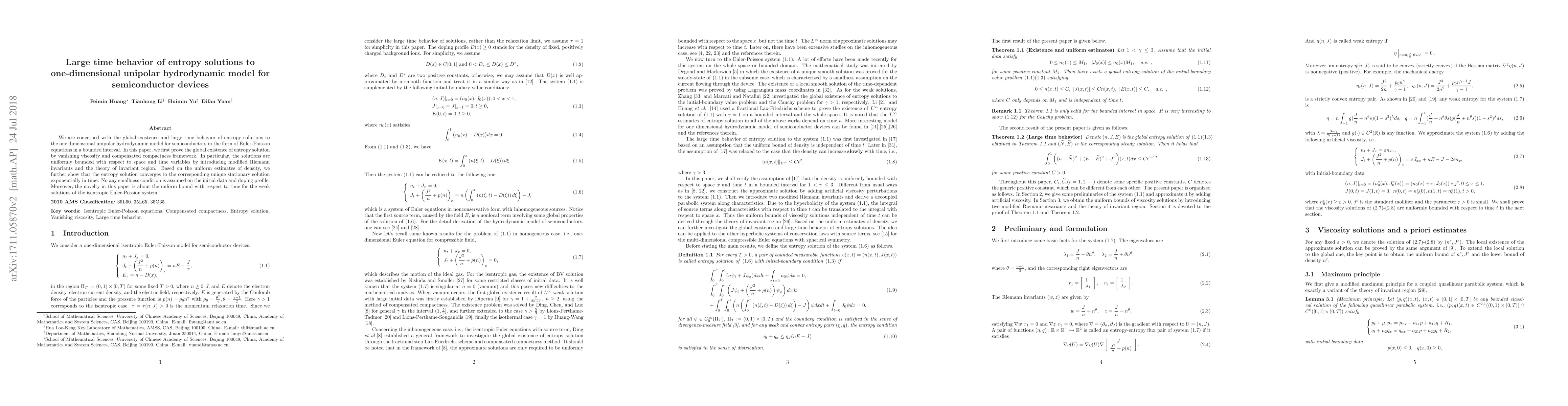 We are concerned with the global existence and large time behavior of entropy solutions to the one dimensional unipolar hydrodynamic model for semiconductors in the form of Euler-Poisson equations in a bounded interval. In this paper, we first prove the global existence of entropy solution by vanishing viscosity and compensated compactness framework. In particular, the solutions are uniformly bounded with respect to space and time variables by introducing modified Riemann invariants and the theory of invariant region. Based on the uniform estimates of density, we further show that the entropy solution converges to the corresponding unique stationary solution exponentially in time. No any smallness condition is assumed on the initial data and doping profile. Moreover, the novelty in this paper is about the unform bound with respect to time for the weak solutions of the isentropic Euler-Possion system.
