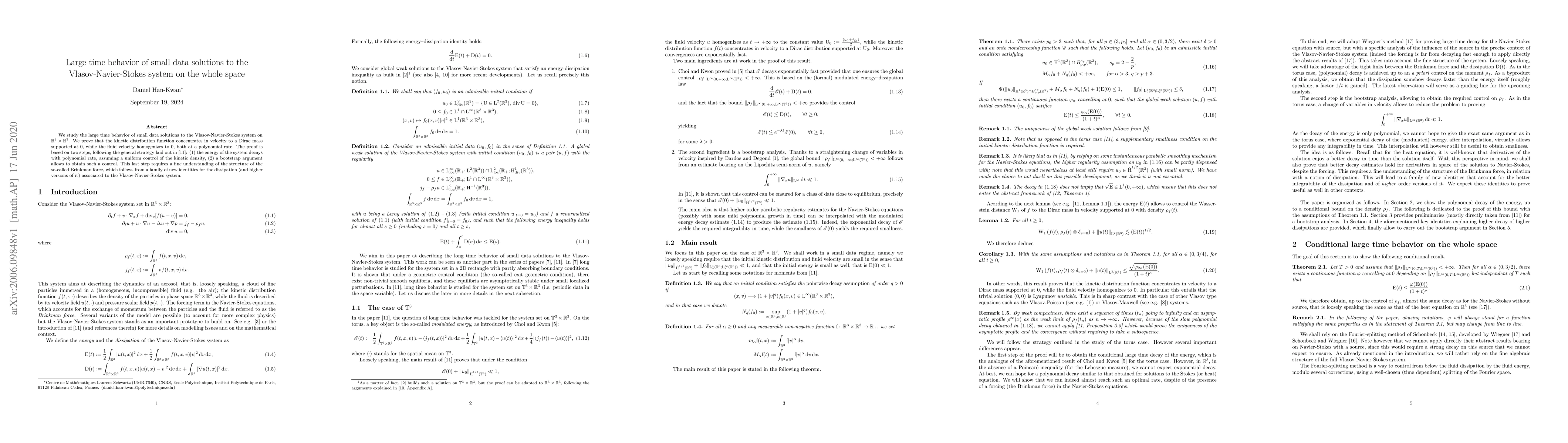 This paper investigates the long-term behavior of small data solutions to the Vlasov-Navier-Stokes system in $\R^3 \times \R^3$, proving that the kinetic distribution converges to a Dirac mass at velocity zero, while the fluid velocity homogenizes to zero, both at a polynomial rate. The proof employs a two-step strategy involving energy decay and a bootstrap argument, leveraging new identities for the dissipation associated with the system.