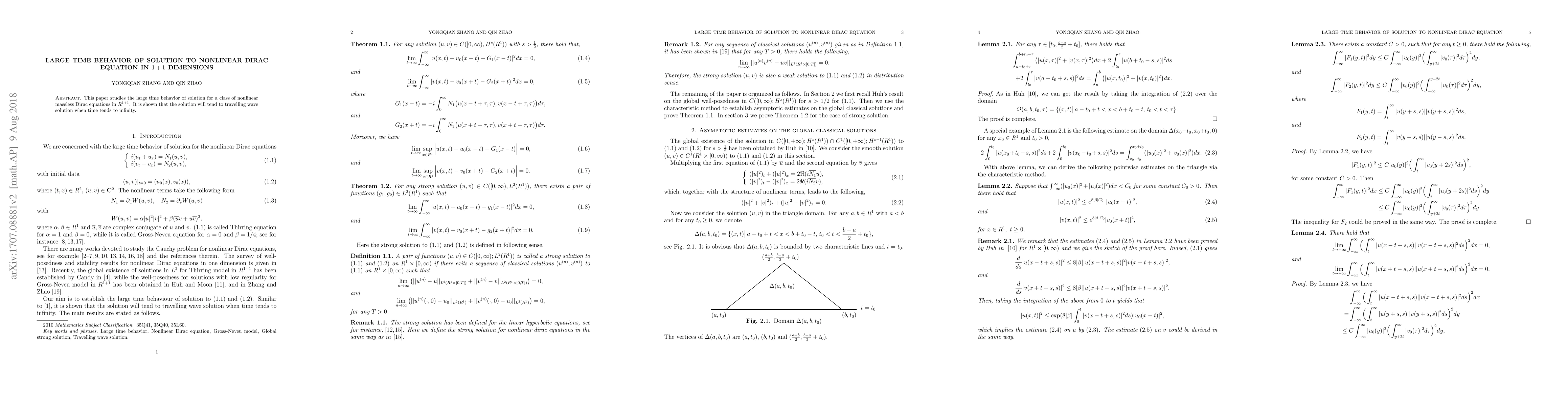 Summary: This paper investigates the large time behavior of solutions to nonlinear massless Dirac equations in 1+1 dimensions, demonstrating that the solutions converge to traveling wave solutions as time approaches infinity.
