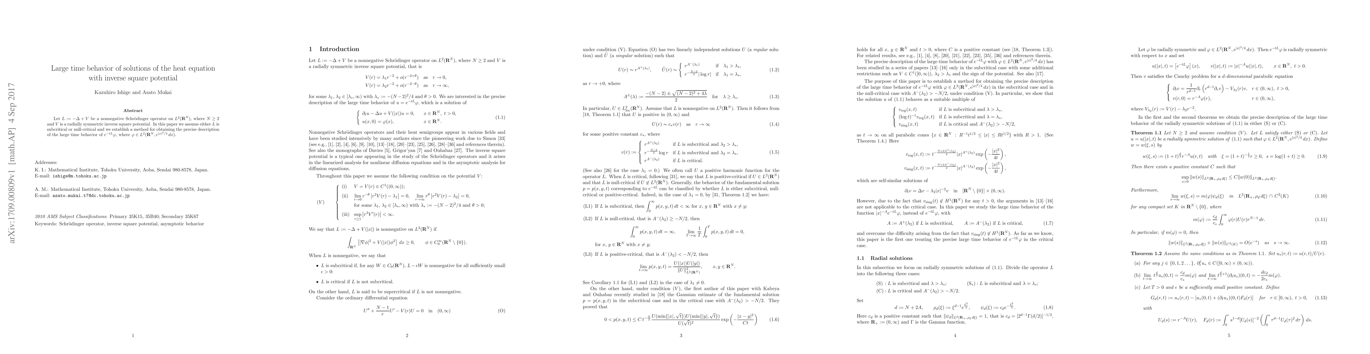 Let $L:=-\Delta+V$ be a nonnegative Schr\"odinger operator on $L^2({\bf R}^N)$, where $N\ge 2$ and $V$ is a radially symmetric inverse square potential. In this paper we assume either $L$ is subcritical or null-critical and we establish a method for obtaining the precise description of the large time behavior of $e^{-tL}\varphi$, where $\varphi\in L^2({\bf R}^N,e^{|x|^2/4}\,dx)$.