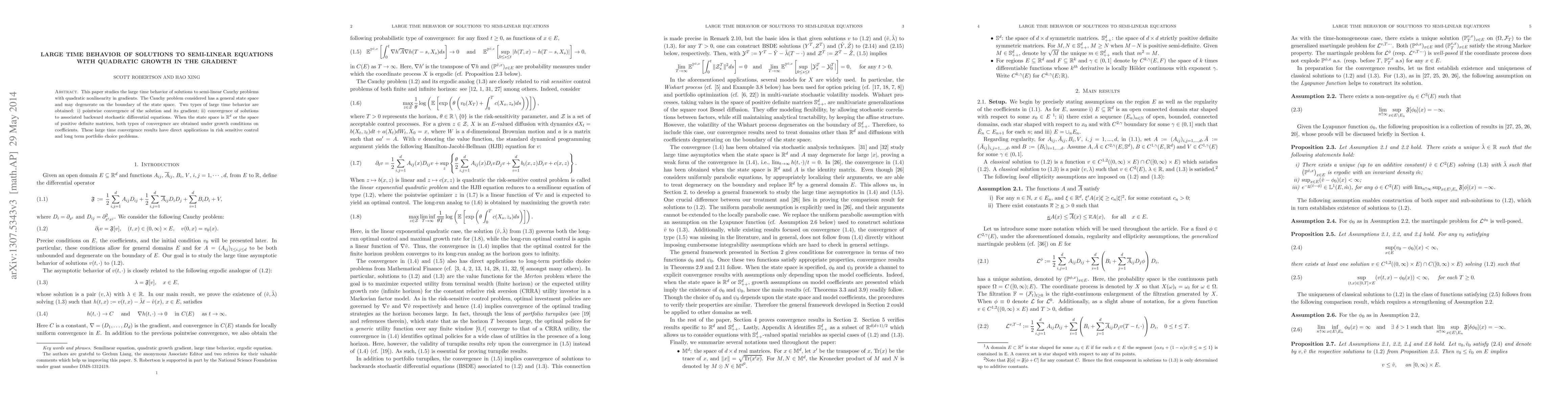 This paper studies the large time behavior of solutions to semi-linear Cauchy problems with quadratic nonlinearity in gradients. The Cauchy problem considered has a general state space and may degenerate on the boundary of the state space. Two types of large time behavior are obtained: i) pointwise convergence of the solution and its gradient; ii) convergence of solutions to associated backward stochastic differential equations. When the state space is R^d or the space of positive definite matrices, both types of convergence are obtained under growth conditions on model coefficients. These large time convergence results have direct applications in risk sensitive control and long term portfolio choice problems.