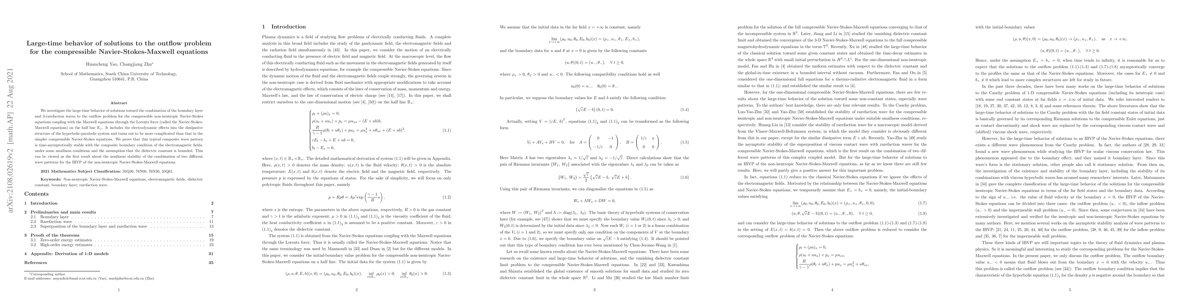 We investigate the large-time behavior of solutions toward the combination of the boundary layer and 3-rarefaction waves to the outflow problem for the compressible non-isentropic Navier-Stokes equations coupling with the Maxwell equations through the Lorentz force (called the Navier-Stokes-Maxwell equations) on the half line $ \mathbb{R}_+ $. It includes the electrodynamic effects into the dissipative structure of the hyperbolic-parabolic system and turns out to be more complicated than that in the simpler compressible Navier-Stokes equations. We prove that this typical composite wave pattern is time-asymptotically stable with the composite boundary condition of the electromagnetic fields, under some smallness conditions and the assumption that the dielectric constant is bounded. This can be viewed as the first result about the nonlinear stability of the combination of two different wave patterns for the IBVP of the non-isentropic Navier-Stokes-Maxwell equations.