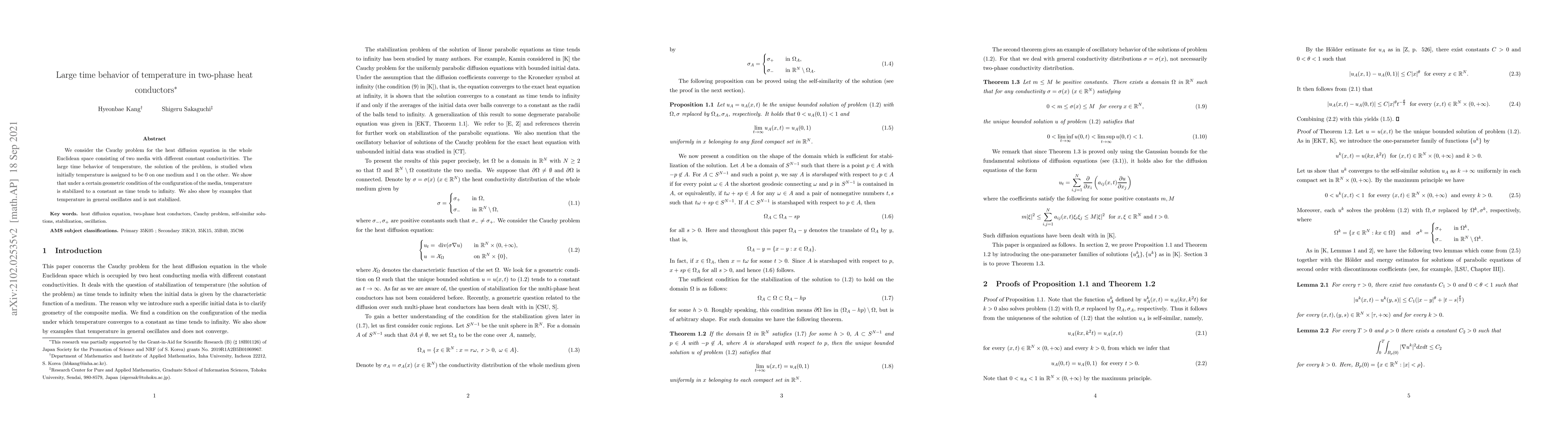 The paper investigates the large time behavior of temperature in two-phase heat conductors, finding that under certain conditions, temperature stabilizes to a constant, while in general cases, it oscillates.
