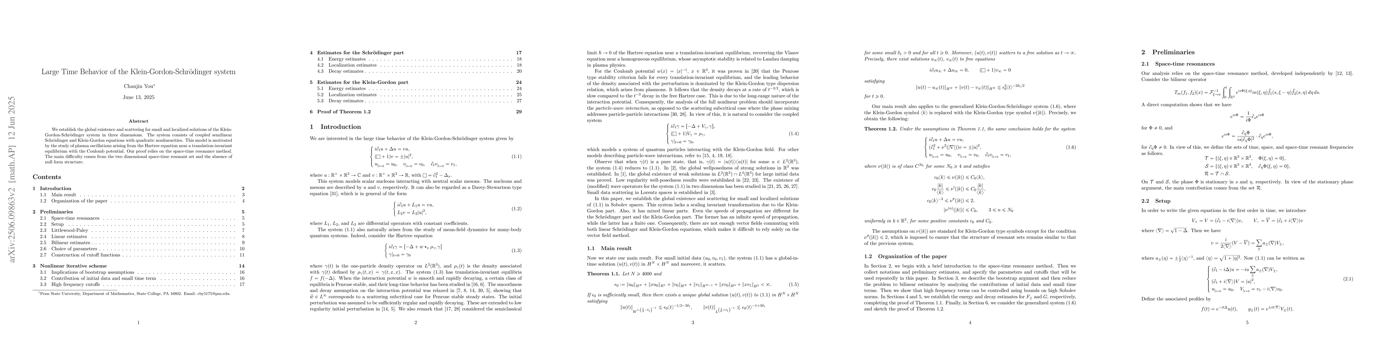 This research proves global existence and scattering for small, localized solutions of the Klein-Gordon-Schrödinger system in 3D, motivated by plasma oscillations in the Hartree equation. The proof uses the space-time resonance method, overcoming challenges posed by a two-dimensional space-time resonant set and lack of null form structure.