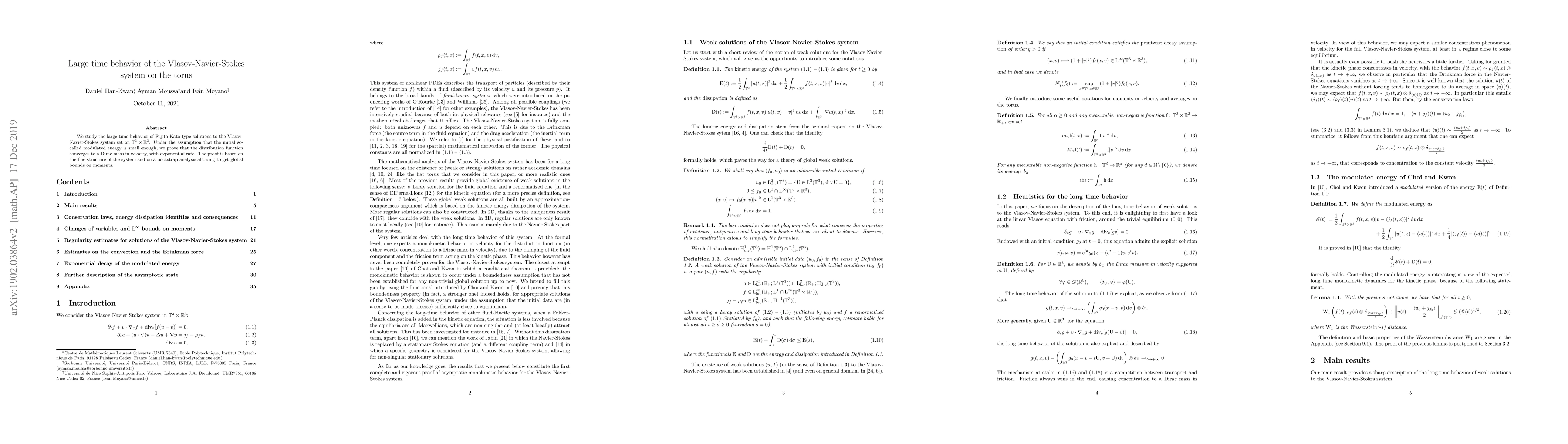 This paper investigates the long-term behavior of Fujita-Kato type solutions for the Vlasov-Navier-Stokes system on the torus, demonstrating that under small initial modulated energy conditions, the distribution function converges to a Dirac mass in velocity with exponential decay. The proof leverages the system's fine structure and a bootstrap analysis for global moment bounds.