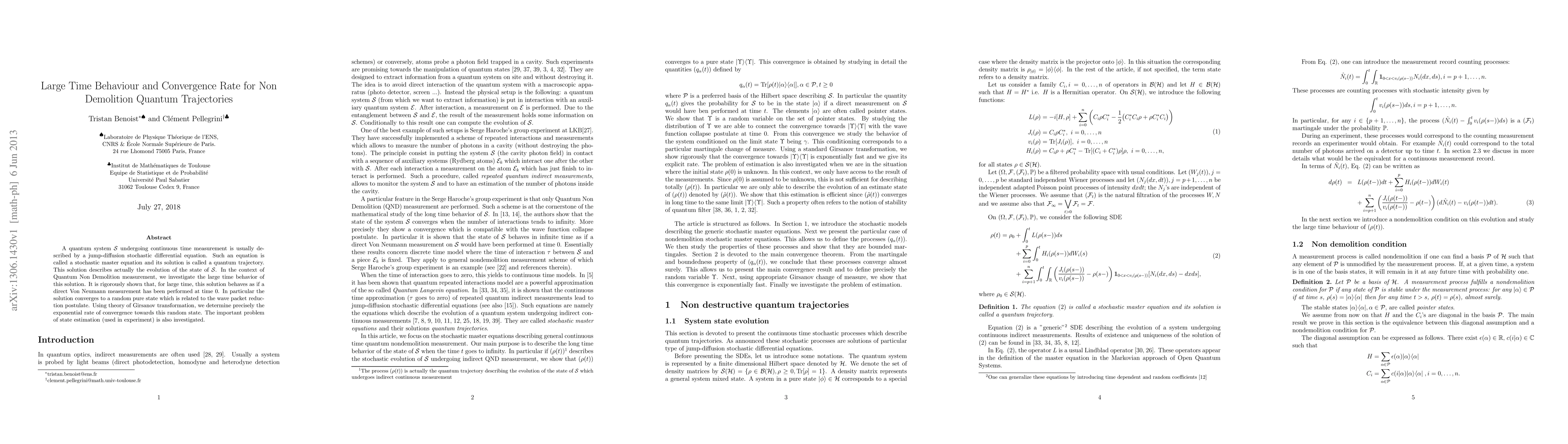 A quantum system S undergoing continuous time measurement is usually described by a jump-diffusion stochastic differential equation. Such an equation is called a stochastic master equation and its solution is called a quantum trajectory. This solution describes actually the evolution of the state of S. In the context of Quantum Non Demolition measurement, we investigate the large time behavior of this solution. It is rigorously shown that, for large time, this solution behaves as if a direct Von Neumann measurement has been performed at time 0. In particular the solution converges to a random pure state which is related to the wave packet reduction postulate. Using theory of Girsanov transformation, we determine precisely the exponential rate of convergence towards this random state. The important problem of state estimation (used in experiment) is also investigated.