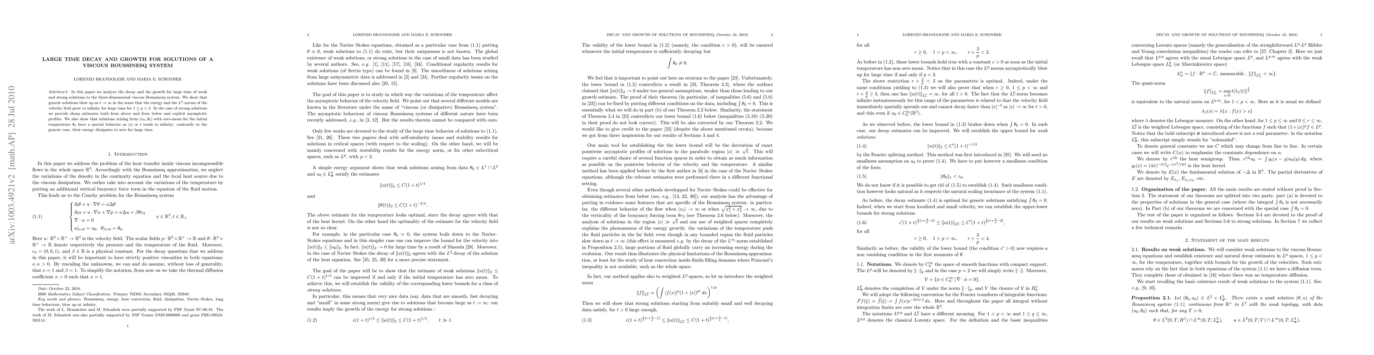 Research shows that solutions to a three-dimensional viscous Boussinesq system exhibit large time decay and growth, with generic solutions blowing up in energy and L^p norms for p < 3, but strong solutions having sharp estimates and explicit profiles.