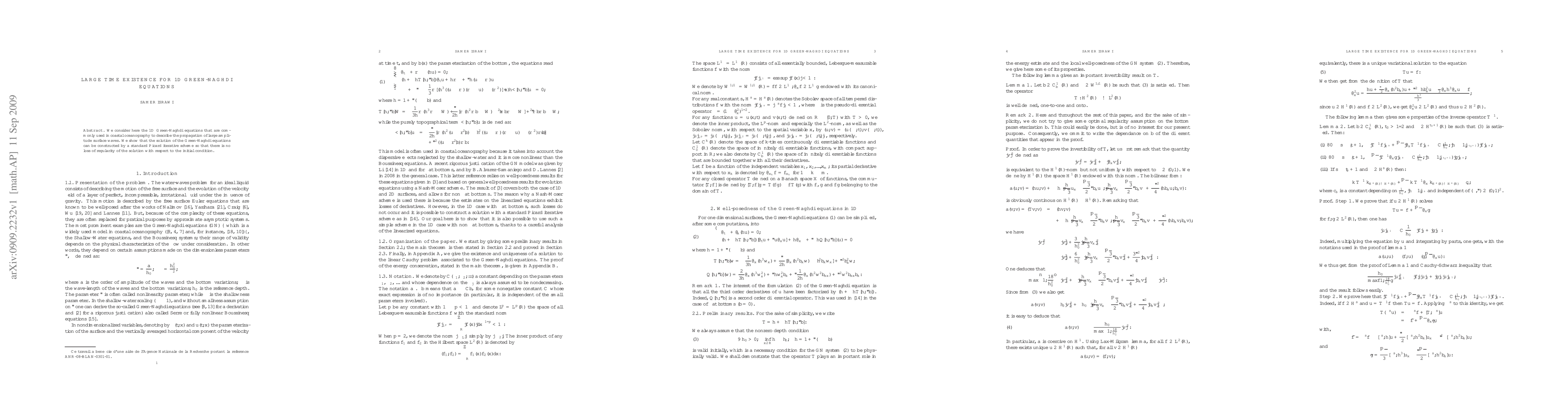 Summary: This paper demonstrates the long-term existence of solutions for the 1D Green-Naghdi equations, which model large amplitude surface waves in coastal oceanography, using a Picard iterative scheme without loss of solution regularity from initial conditions.