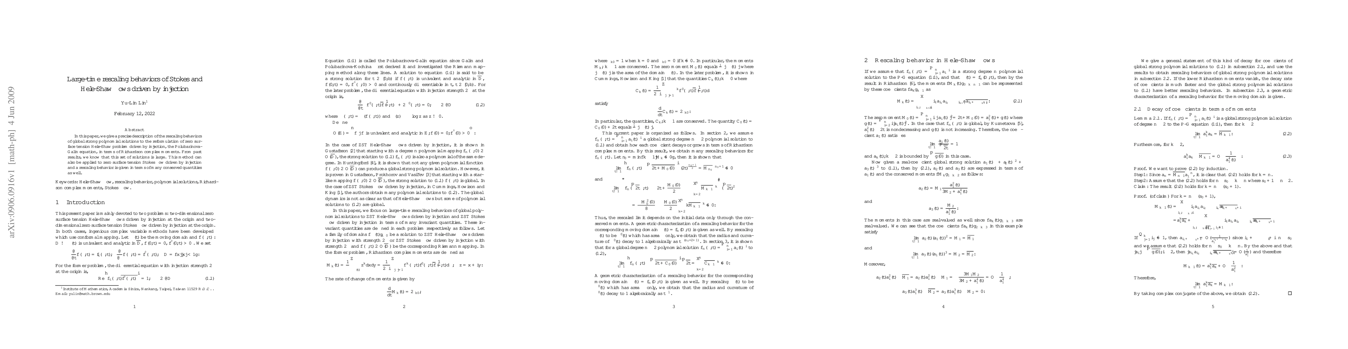 This paper analyzes the large-time rescaling behaviors of both Hele-Shaw and Stokes flows driven by injection, providing detailed descriptions of global strong polynomial solutions through Richardson complex moments and conserved quantities. The method is shown to be applicable to both flow types.