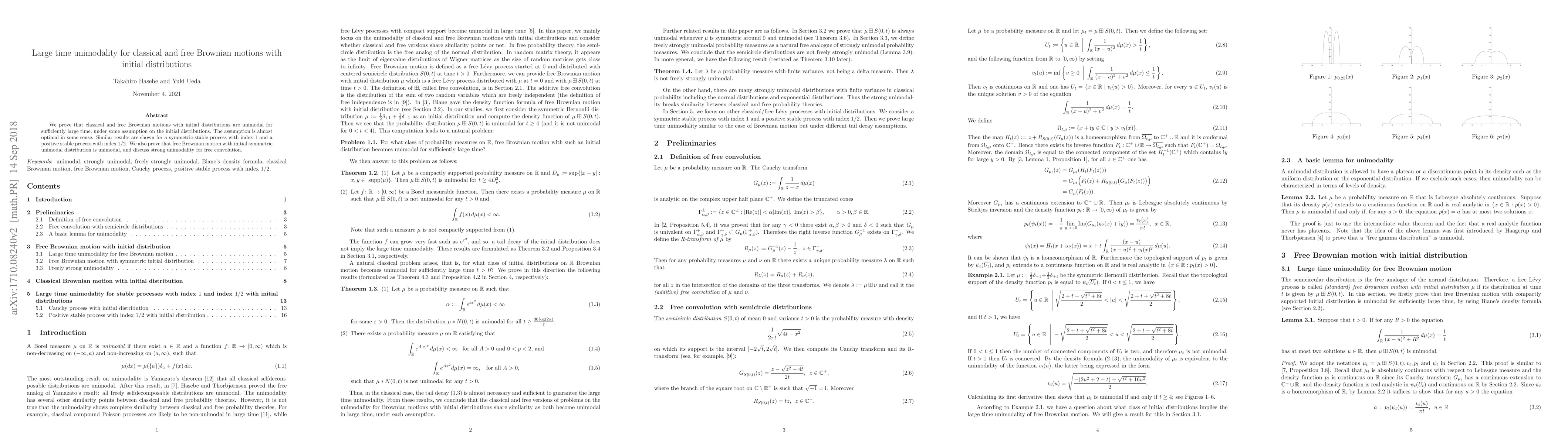 We prove that classical and free Brownian motions with initial distributions are unimodal for sufficiently large time, under some assumption on the initial distributions. The assumption is almost optimal in some sense. Similar results are shown for a symmetric stable process with index 1 and a positive stable process with index $1/2$. We also prove that free Brownian motion with initial symmetric unimodal distribution is unimodal, and discuss strong unimodality for free convolution.