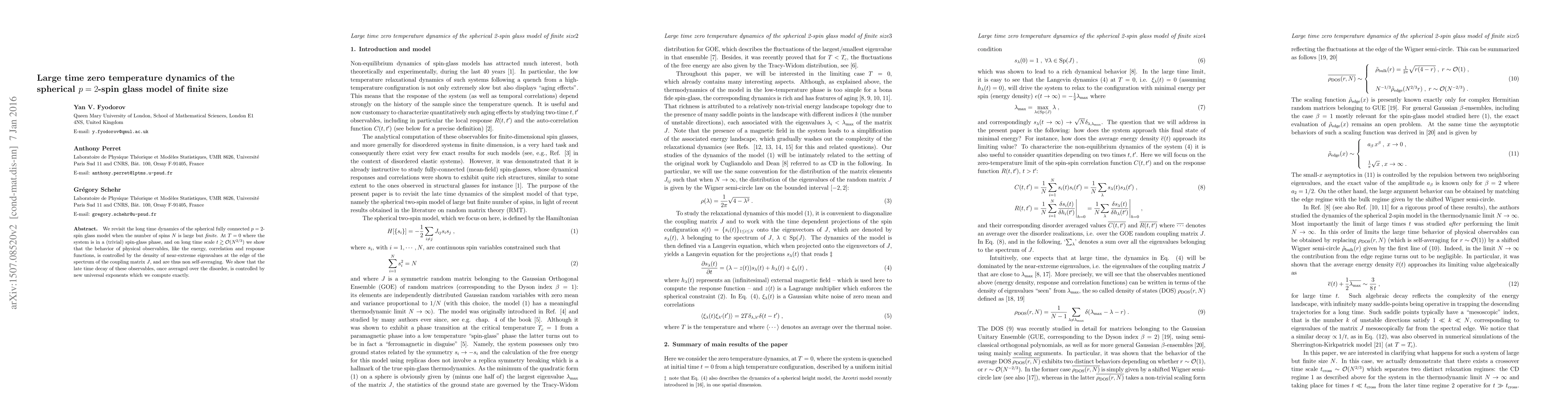 We revisit the long time dynamics of the spherical fully connected $p = 2$-spin glass model when the number of spins $N$ is large but {\it finite}. At $T=0$ where the system is in a (trivial) spin-glass phase, and on long time scale $t \gtrsim {\cal O}{(N^{2/3})}$ we show that the behavior of physical observables, like the energy, correlation and response functions, is controlled by the density of near-extreme eigenvalues at the edge of the spectrum of the coupling matrix $J$, and are thus non self-averaging. We show that the late time decay of these observables, once averaged over the disorder, is controlled by new universal exponents which we compute exactly.