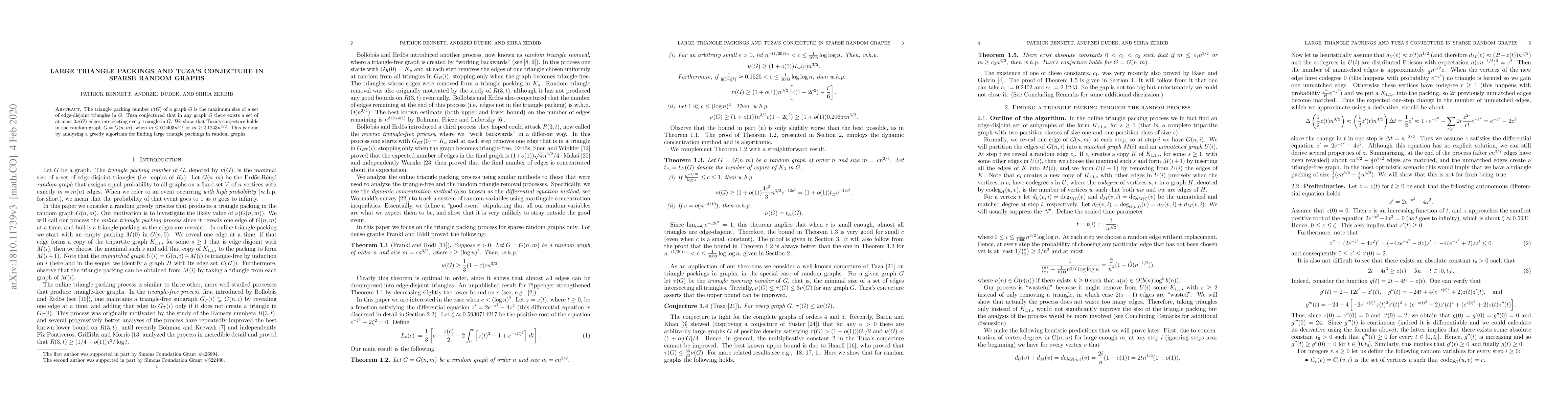 This paper proves Tuza's conjecture for sparse random graphs by demonstrating that in $G(n,m)$ with $m \le 0.2403n^{3/2}$ or $m \ge 2.1243n^{3/2}$, there exists a set of at most $2\nu(G)$ edges intersecting every triangle, using a greedy algorithm to find large triangle packings.