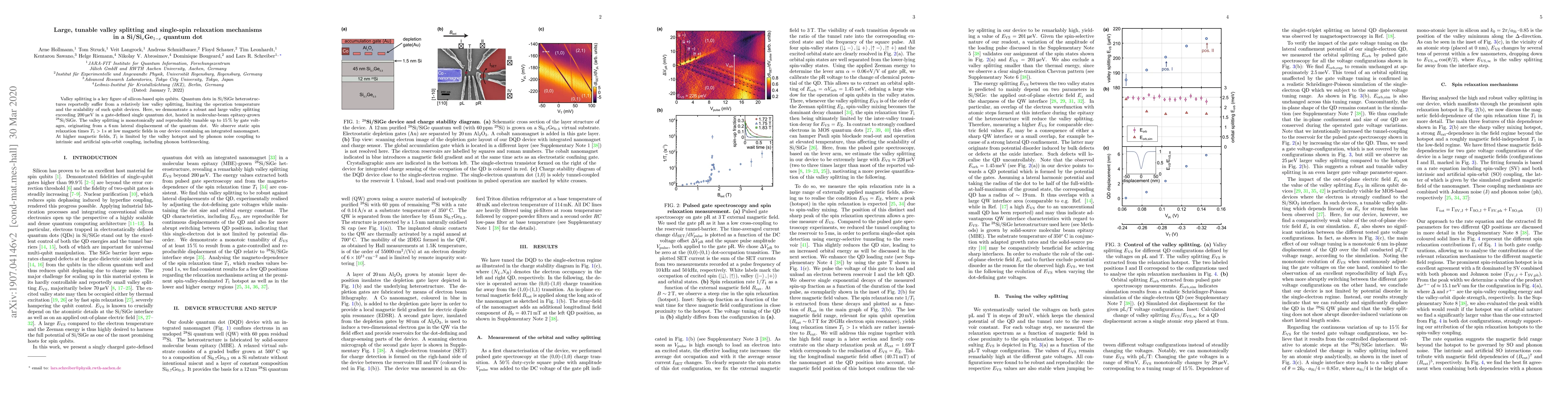 This paper demonstrates a large, tunable valley splitting exceeding 200 µeV in a Si/SiGe quantum dot, enabling gate-controlled adjustments up to 15% through a 6 nm lateral displacement. The study also reports static spin relaxation times $T_1 > 1$ s at low magnetic fields, with limitations at higher fields due to valley hotspots and phonon noise coupling.
