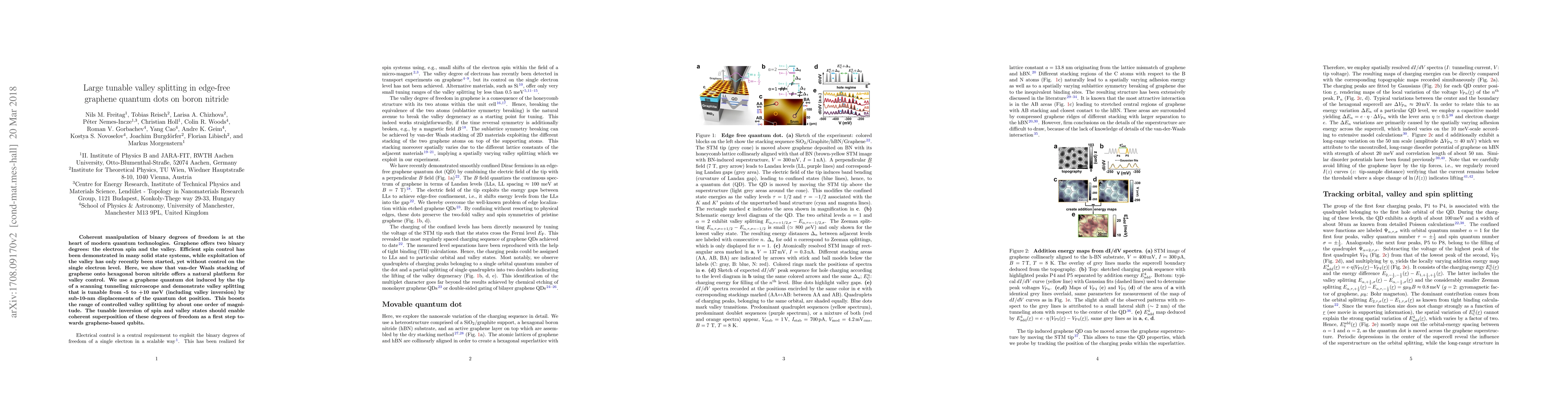 This paper demonstrates large tunable valley splitting in graphene quantum dots on boron nitride, achieved through van-der Waals stacking, enabling valley control via sub-10-nm displacements. This advancement could facilitate coherent superposition of spin and valley states for potential graphene-based qubits.