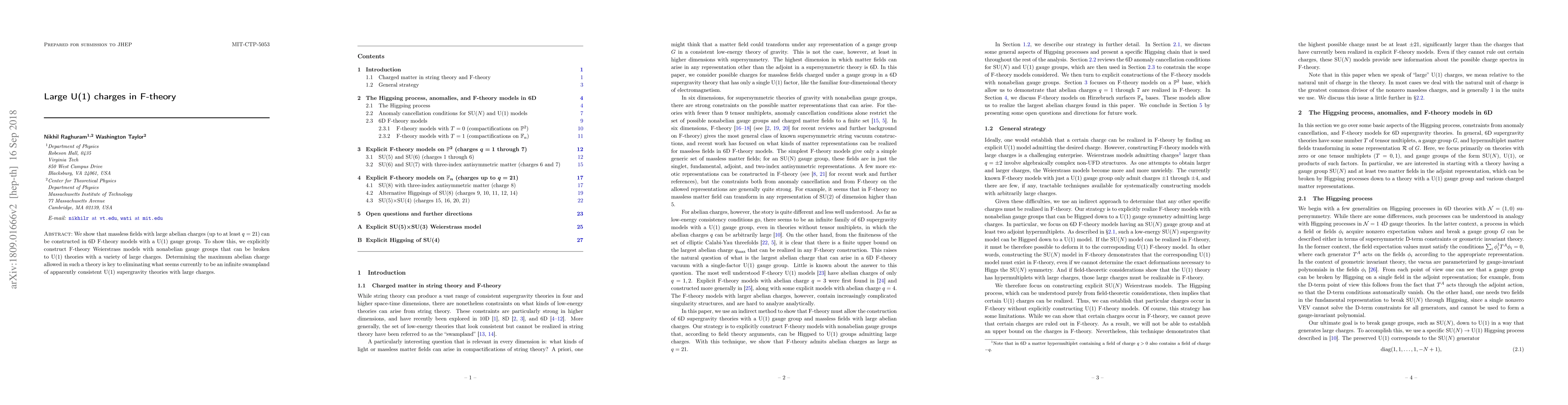 We show that massless fields with large abelian charges (up to at least q = 21) can be constructed in 6D F-theory models with a U(1) gauge group. To show this, we explicitly construct F-theory Weierstrass models with nonabelian gauge groups that can be broken to U(1) theories with a variety of large charges. Determining the maximum abelian charge allowed in such a theory is key to eliminating what seems currently to be an infinite swampland of apparently consistent U(1) supergravity theories with large charges.