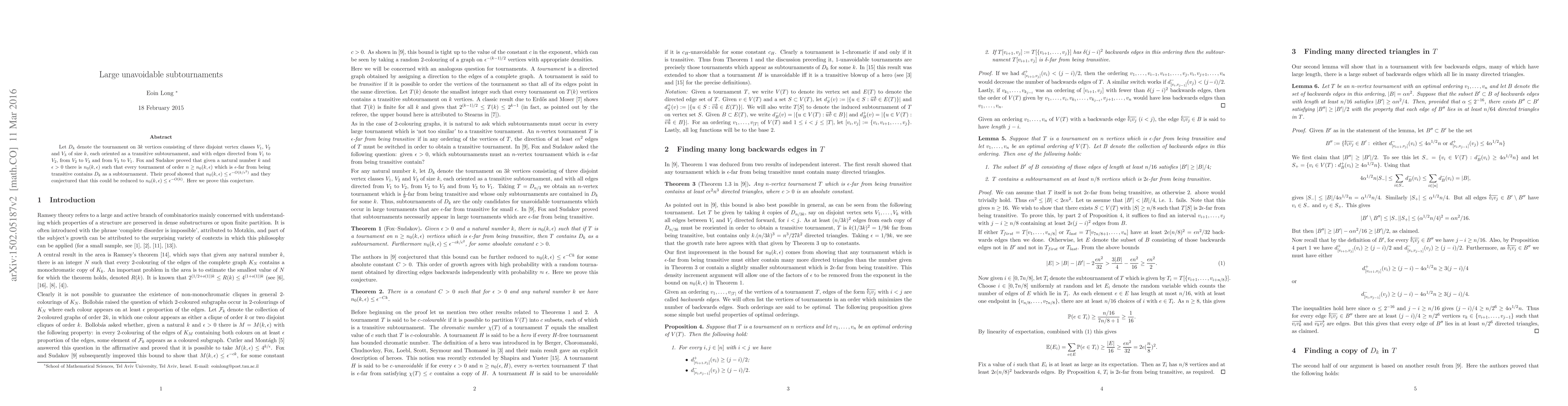 Researchers prove that for every natural number k and epsilon > 0, there exists a threshold n_0(k,epsilon) beyond which any non-transitive tournament of order n_0(k,epsilon) must contain the subtournament D_k, as conjectured by Fox and Sudakov.