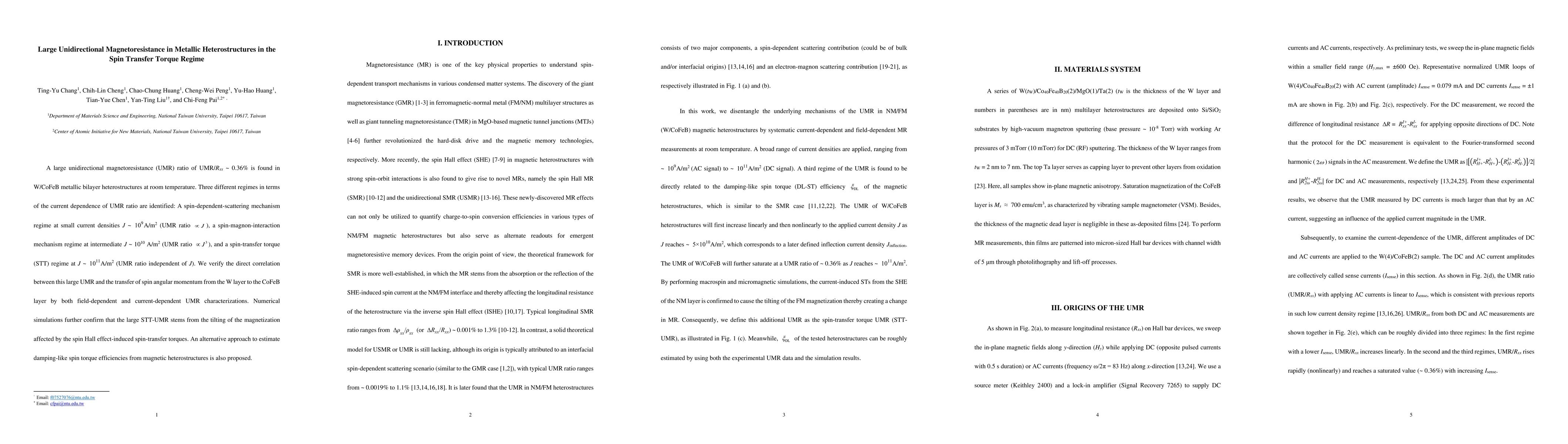 This paper reports a large unidirectional magnetoresistance (UMR) of 0.36% in W/CoFeB metallic bilayers at room temperature, identifying three distinct current-dependent regimes. The study verifies the correlation between this UMR and spin angular momentum transfer via spin-transfer torque, supported by simulations and an alternative method for estimating damping-like spin-torque efficiencies.
