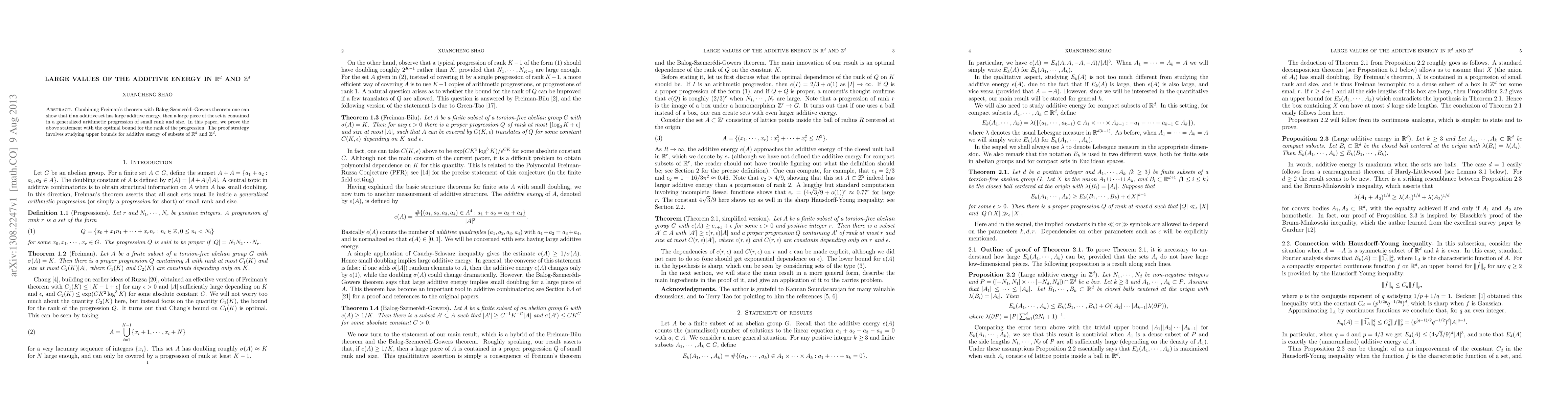 Combining Freiman's theorem with Balog-Szemeredi-Gowers theorem one can show that if an additive set has large additive energy, then a large piece of the set is contained in a generalized arithmetic progression of small rank and size. In this paper, we prove the above statement with the optimal bound for the rank of the progression. The proof strategy involves studying upper bounds for additive energy of subsets of R^d and Z^d.