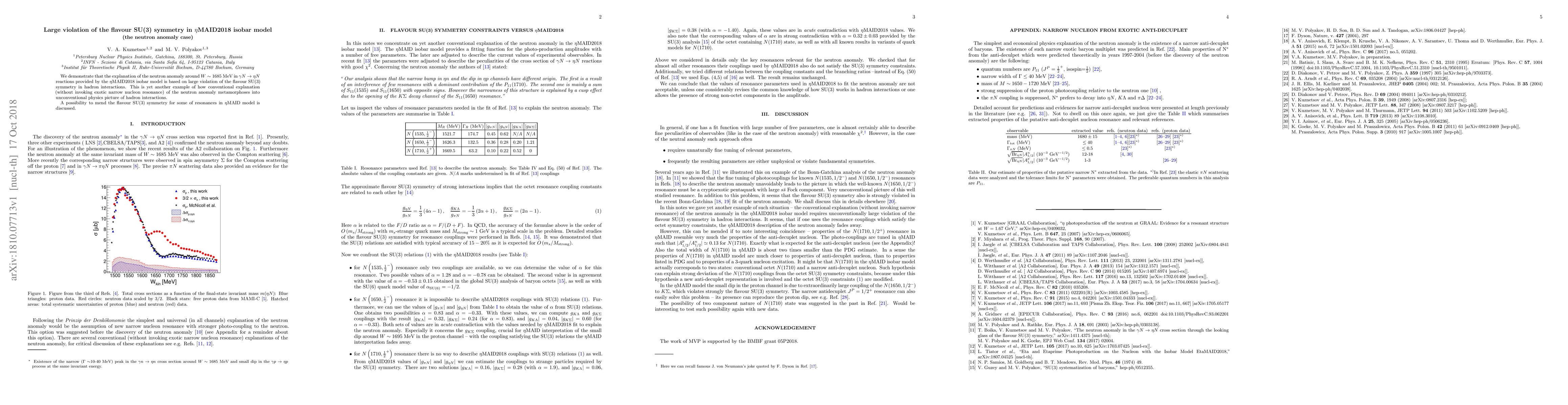 We demonstrate that the explanation of the neutron anomaly around $W\sim 1685$MeV in $\gamma N\to \eta N$ reactions provided by the $\eta$MAID2018 isobar model is based on large violation of the flavour SU(3) symmetry in hadron interactions. This is yet another example of how conventional explanation (without invoking exotic narrow nucleon resonance) of the neutron anomaly metamorphoses into unconventional physics picture of hadron interactions. A possibility to mend the flavour SU(3) symmetry for some of resonances in $\eta$MAID model is discussed.