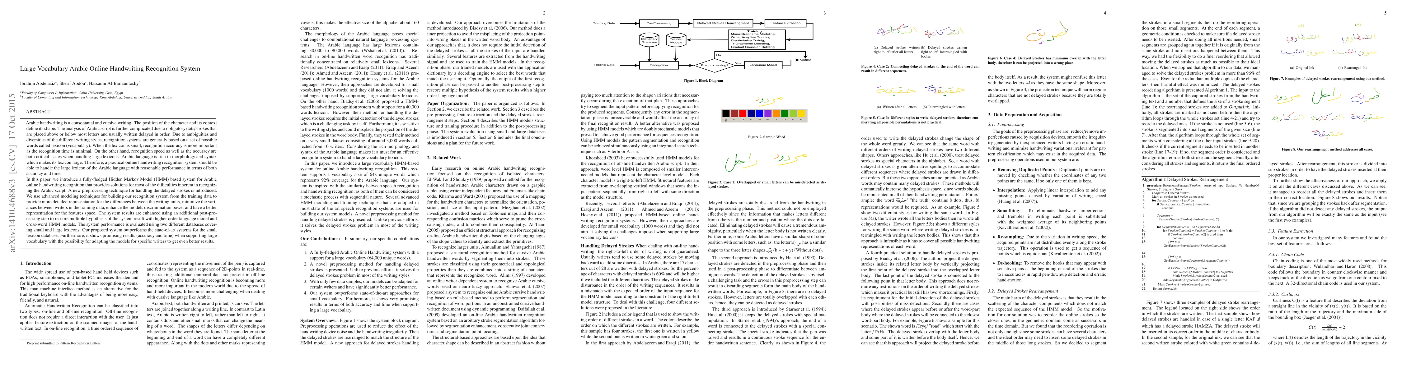 This paper introduces a Hidden Markov Model (HMM) based system for large vocabulary Arabic online handwriting recognition, employing advanced preprocessing and modeling techniques to handle script ambiguities and improve accuracy and speed, demonstrating superior performance over existing systems in both small and large lexicon scenarios.