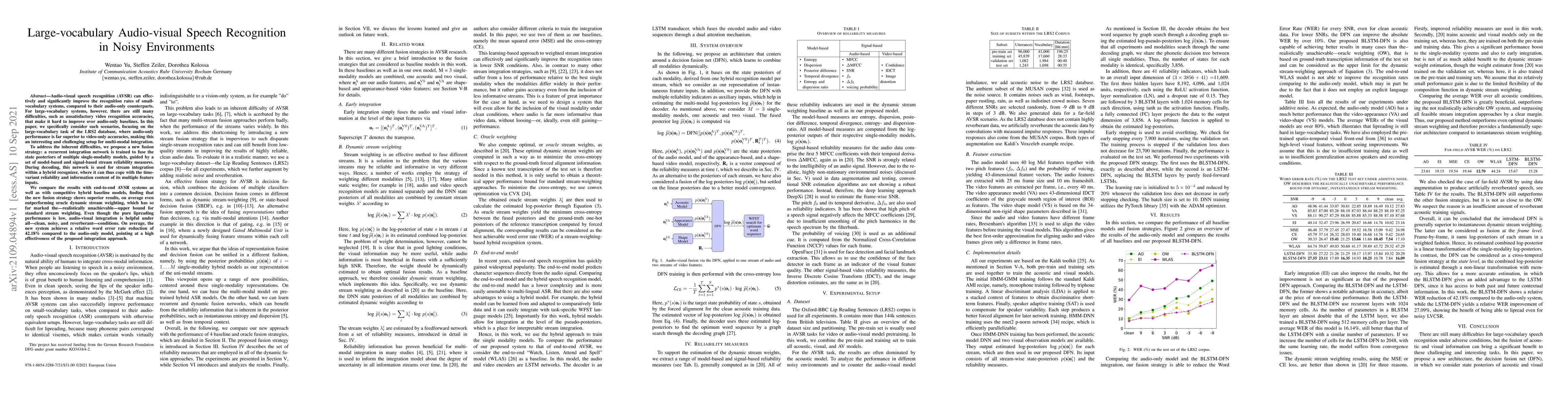 This paper proposes a new fusion strategy for large-vocabulary audio-visual speech recognition in noisy environments, using a recurrent integration network to combine state posteriors from audio and visual models. The approach achieves a 42.18% relative reduction in word error rate compared to audio-only models, demonstrating the effectiveness of audio-visual integration across various acoustic conditions.