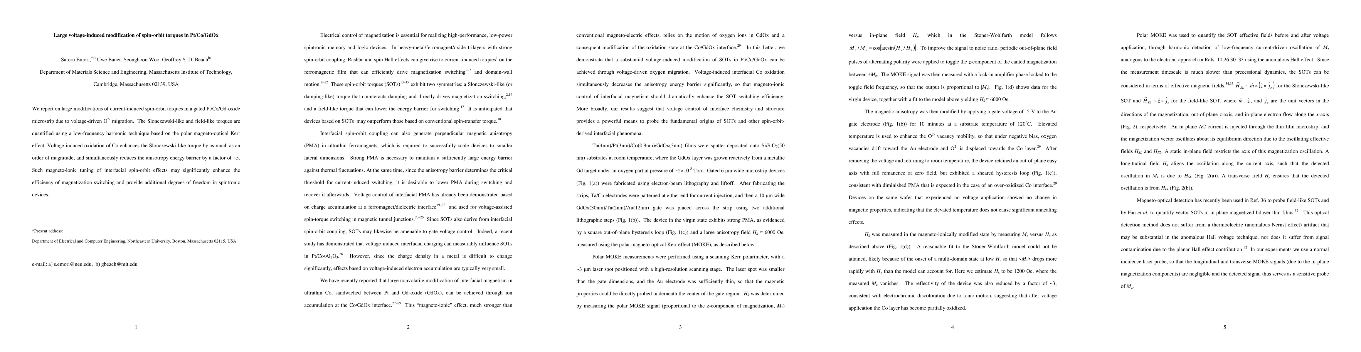 This paper investigates significant changes in spin-orbit torques in Pt/Co/GdOx microstrips due to voltage-induced oxygen migration, enhancing Slonczewski-like torque and reducing the anisotropy energy barrier. Such magneto-ionic tuning could improve magnetization switching efficiency and offer new functionalities in spintronic devices.