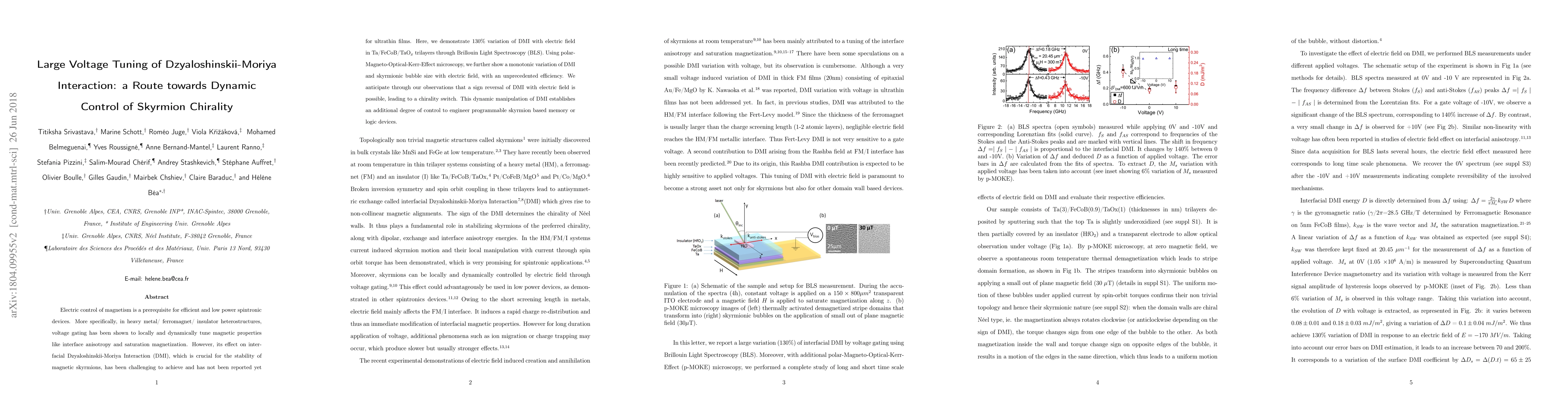 This paper demonstrates a 130% variation in Dzyaloshinskii-Moriya Interaction (DMI) via electric field in Ta/FeCoB/TaOx trilayers, enabling dynamic control of skyrmion chirality. This voltage-induced tuning of DMI could pave the way for efficient, low-power spintronic devices.