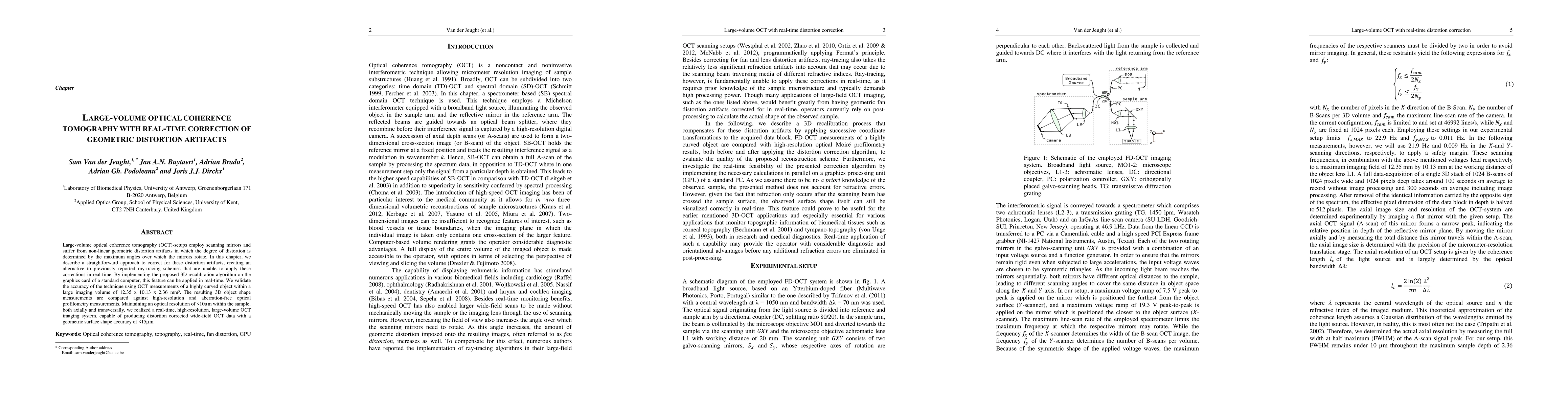 Large-volume optical coherence tomography (OCT)-setups employ scanning mirrors and suffer from non-linear geometric distortion artifacts in which the degree of distortion is determined by the maximum angles over which the mirrors rotate. In this chapter, we describe a straightforward approach to correct for these distortion artifacts, creating an alternative to previously reported ray-tracing schemes that are unable to apply these corrections in real-time. By implementing the proposed 3D recalibration algorithm on the graphics card of a standard computer, this feature can be applied in real-time. We validate the accuracy of the technique using OCT measurements of a highly curved object within a large imaging volume of 12.35 x 10.13 x 2.36 mm^3. The resulting 3D object shape measurements are compared against high-resolution and aberration-free optical profilometry measurements. Maintaining an optical resolution of <10 micron within the sample, both axially and transversally, we realized a real-time, high-resolution, large-volume OCT imaging system, capable of producing distortion corrected wide-field OCT data with a geometric surface shape accuracy of <15 micron.