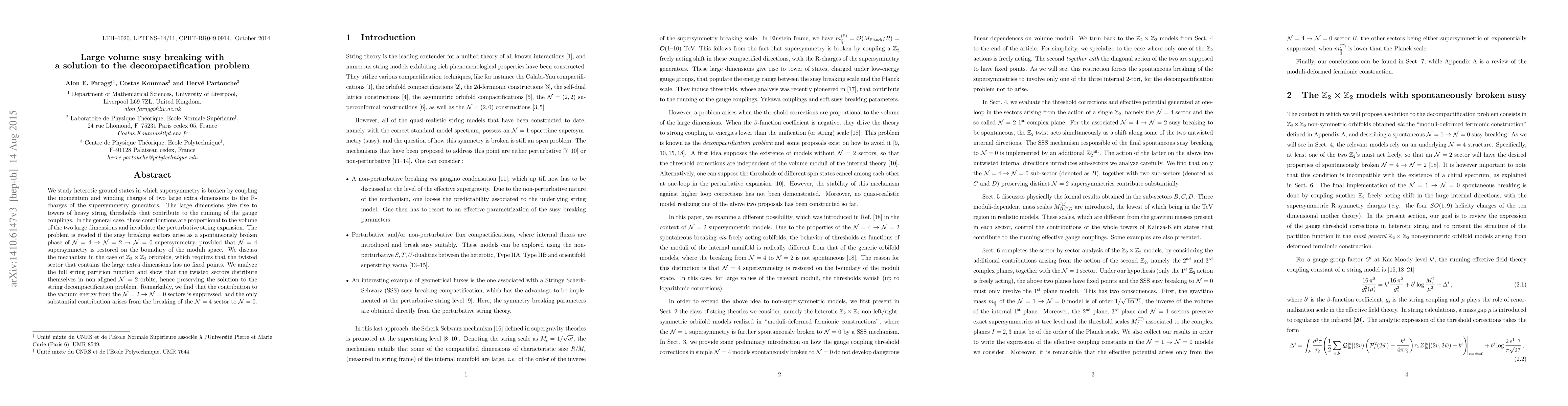 We study heterotic ground states in which supersymmetry is broken by coupling the momentum and winding charges of two large extra dimensions to the R-charges of the supersymmetry generators. The large dimensions give rise to towers of heavy string thresholds that contribute to the running of the gauge couplings. In the general case, these contributions are proportional to the volume of the two large dimensions and invalidate the perturbative string expansion. The problem is evaded if the susy breaking sectors arise as a spontaneously broken phase of N=4 -> N=2 -> N=0 supersymmetry, provided that N=4 supersymmetry is restored on the boundary of the moduli space. We discuss the mechanism in the case of Z_2 x Z_2 orbifolds, which requires that the twisted sector that contains the large extra dimensions has no fixed points. We analyse the full string partition function and show that the twisted sectors distribute themselves in non-aligned N=2 orbits, hence preserving the solution to the string decompactification problem. Remarkably, we find that the contribution to the vacuum energy from the N=2 -> N=0 sectors is suppressed, and the only substantial contribution arises from the breaking of the N=4 sector to N=0.