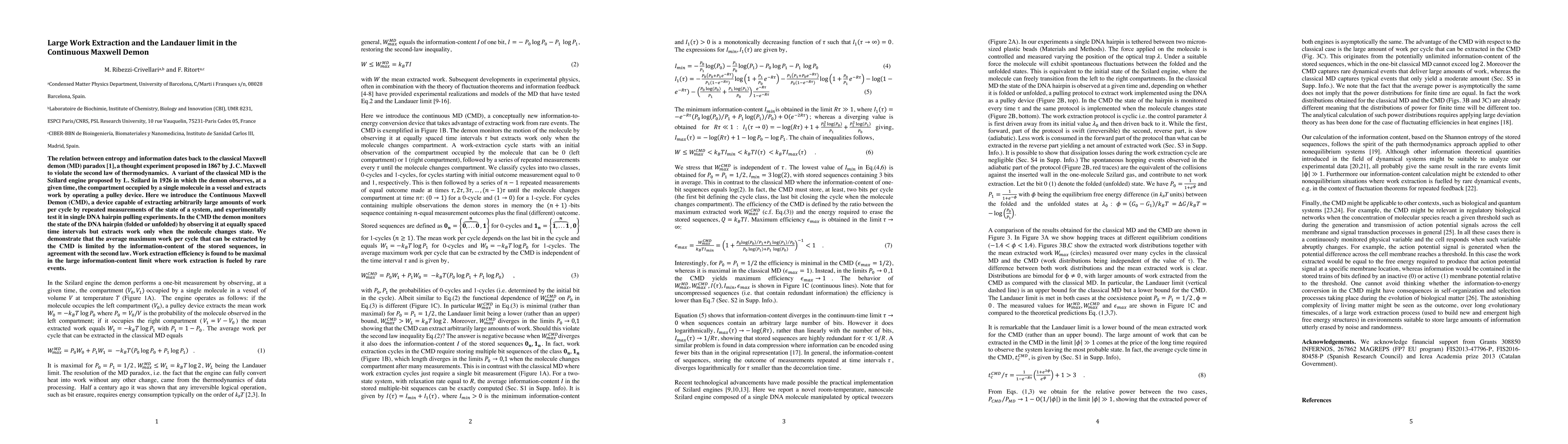 This paper introduces the Continuous Maxwell Demon (CMD) which repeatedly measures the state of a DNA hairpin to extract large amounts of work, demonstrating that the maximum work extraction is limited by the information content, aligning with the second law of thermodynamics. The work extraction efficiency is highest when driven by rare state changes.