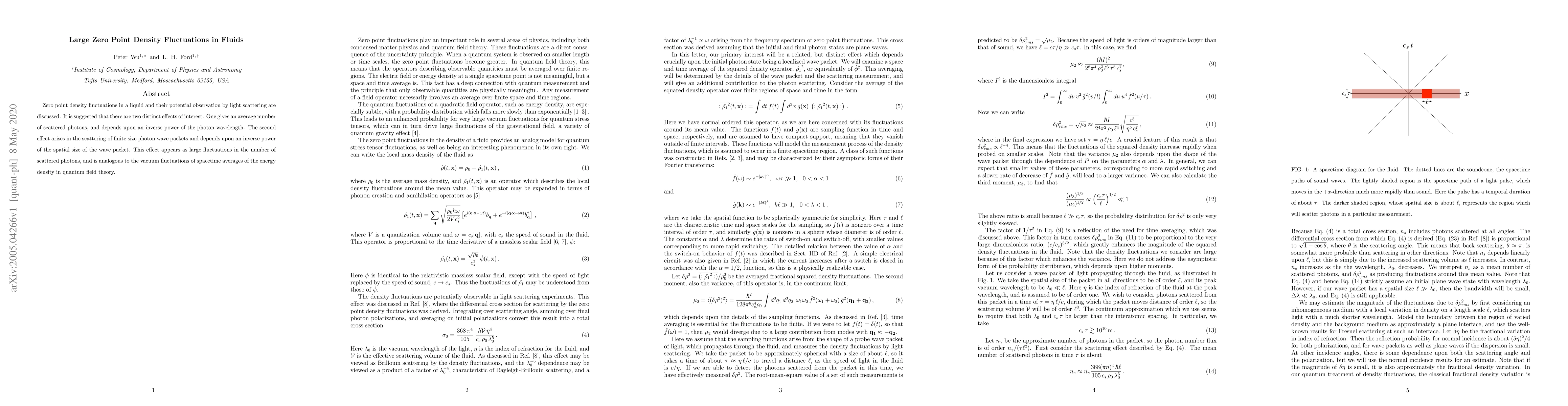 Zero point density fluctuations in a liquid and their potential observation by light scattering are discussed. It is suggested that there are two distinct effects of interest. One gives an average number of scattered photons, and depends upon an inverse power of the photon wavelength. The second effect arises in the scattering of finite size photon wave packets and depends upon an inverse power of the spatial size of the wave packet. This effect appears as large fluctuations in the number of scattered photons, and is analogous to the vacuum fluctuations of spacetime averages of the energy density in quantum field theory.