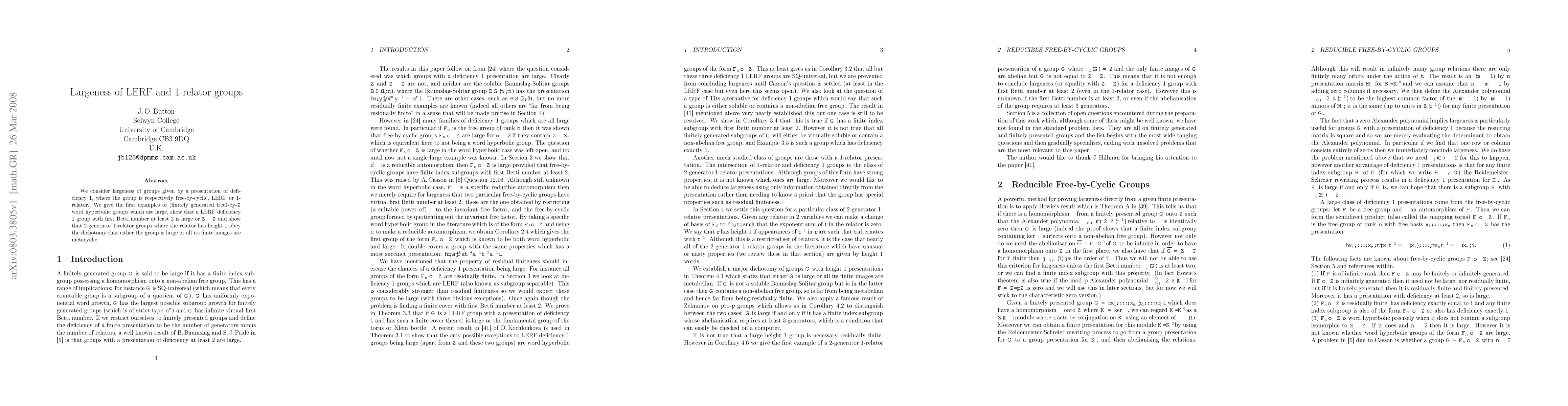 This paper explores the largeness properties of groups with deficiency 1 presentations, specifically focusing on free-by-cyclic, LERF, and 1-relator groups. It provides examples of large word hyperbolic groups and establishes that certain LERF and 2-generator 1-relator groups either are large or have metacyclic finite images.