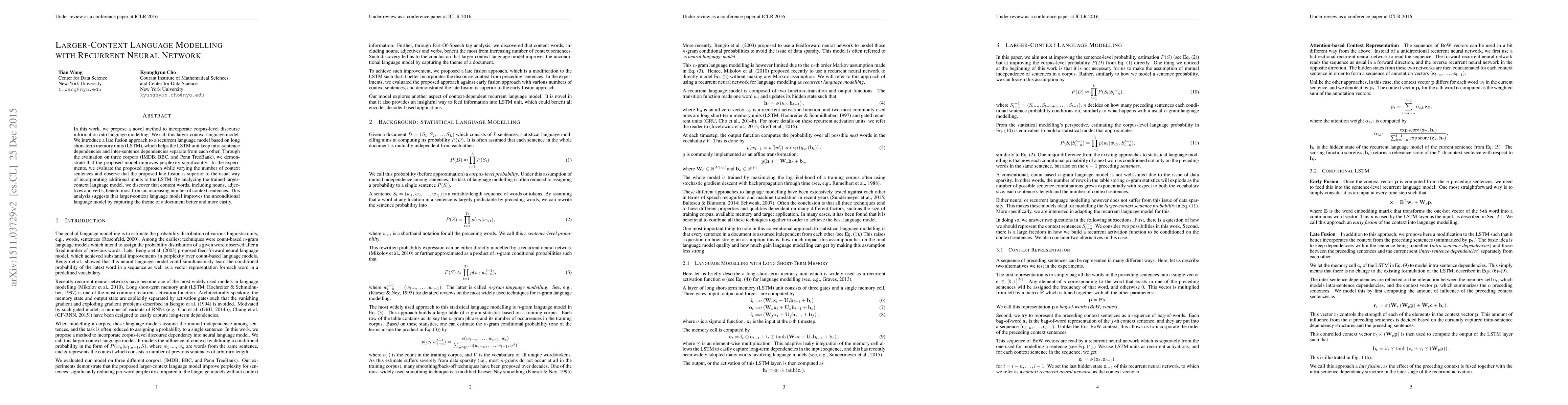 This paper introduces a novel method to enhance language modeling by incorporating corpus-level discourse information, termed the larger-context language model. The proposed late fusion approach with LSTM units effectively separates intra-sentence and inter-sentence dependencies, leading to significant improvements in perplexity across multiple corpora. The study suggests that the model benefits most from content words and captures document themes more effectively.