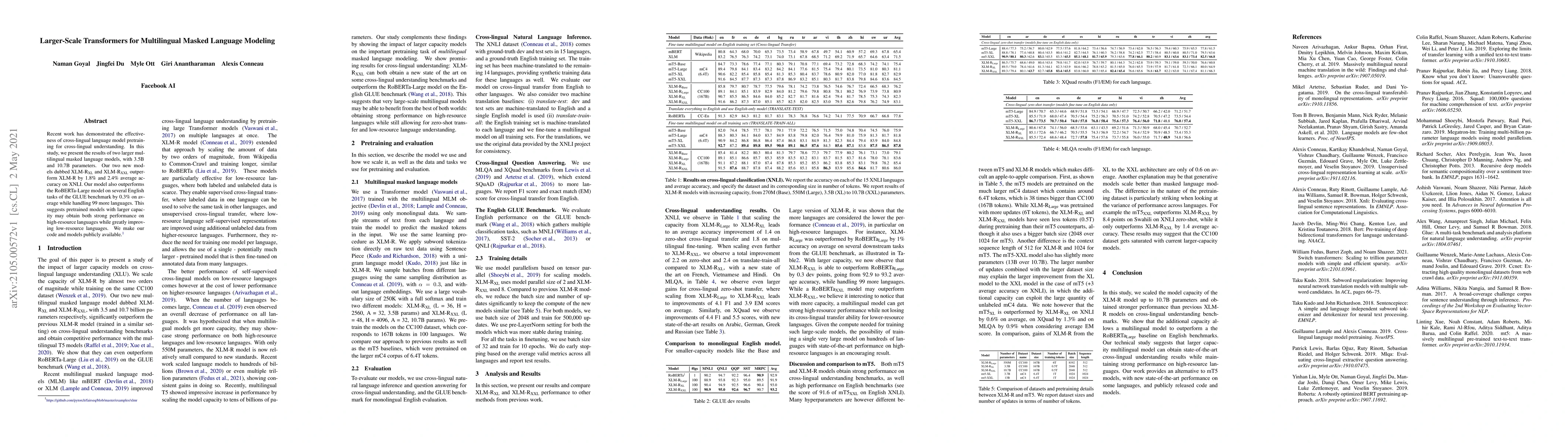 This study introduces two larger multilingual masked language models, XLM-R XL and XLM-R XXL, which outperform previous XLM-R models by 1.8% and 2.4% on the XNLI benchmark, and also surpass RoBERTa-Large on several English GLUE tasks while supporting 99 more languages.