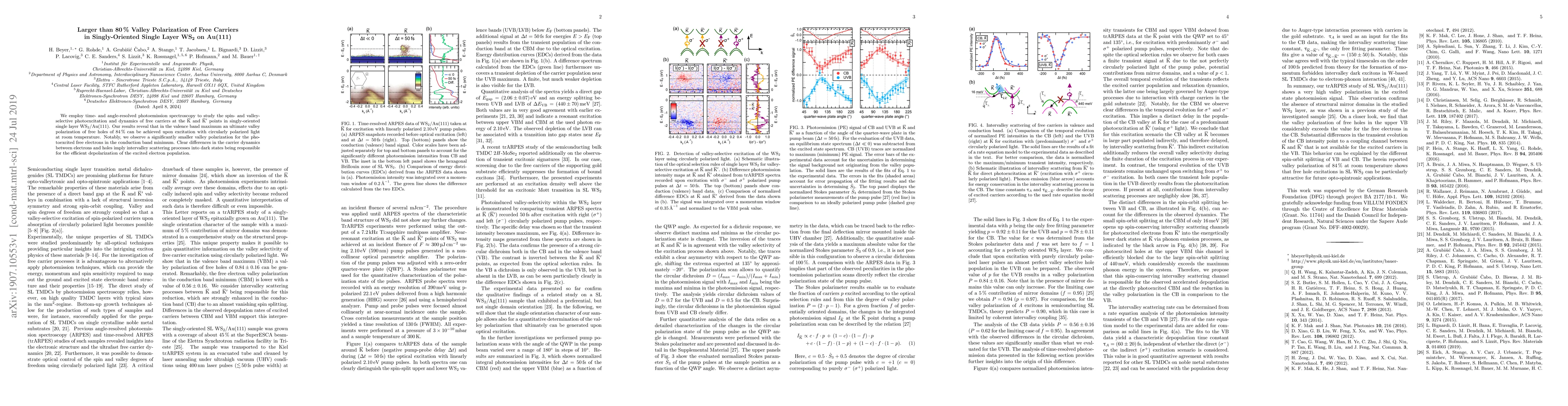 This study uses time- and angle-resolved photoemission spectroscopy to investigate spin- and valley-selective photoexcitation in single layer WS$_2$ on Au(111). It finds an 84% valley polarization of free holes in the valence band maximum with circularly polarized light, while free electrons show much lower valley polarization due to intervalley scattering into dark states.