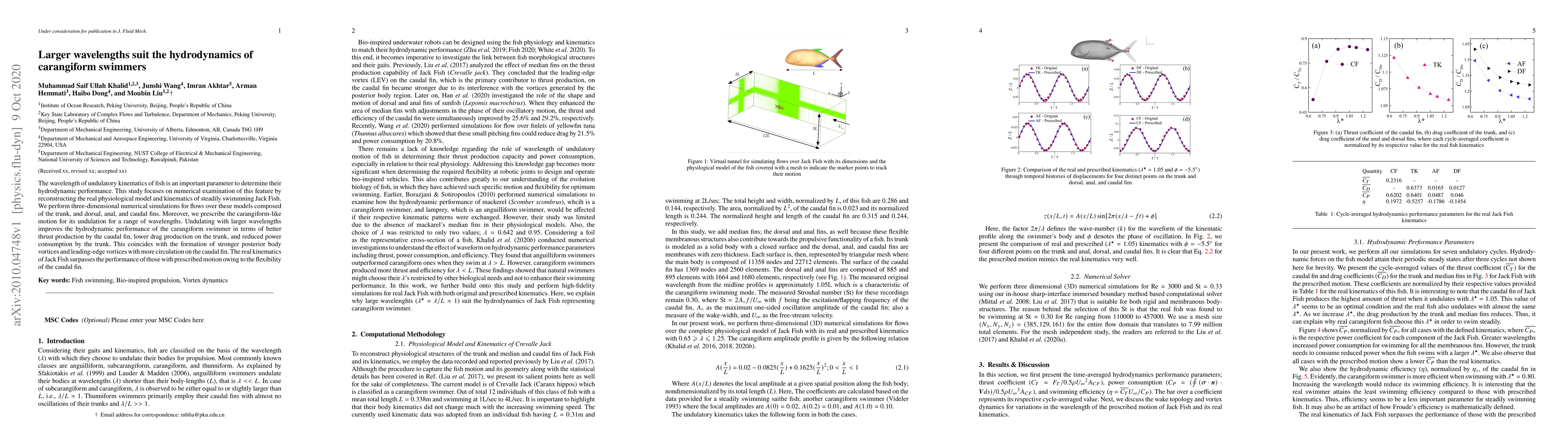 The wavelength of undulatory kinematics of fish is an important parameter to determine their hydrodynamic performance. This study focuses on numerical examination of this feature by reconstructing the real physiological model and kinematics of steadily swimmning Jack Fish. We perform three-dimensional numerical simulations for flows over these models composed of the trunk, and dorsal, anal, and caudal fins. Moreover, we prescribe the carangiform-like motion for its undulation for a range of wavelengths. Undulation with larger wavelengths improves the hydrodynamic performance of the carangiform swimmer in terms of better thrust production by the caudal fin, lower drag production on the trunk, and reduced power consumption by the trunk. This coincides with the formation of stronger posterior body vortices and leading-edge vortices with more circulation on the caudal fin. The real kinematics of Jack Fish surpasses the performance of those with prescribed motion owing to the flexibility of the caudal fin.