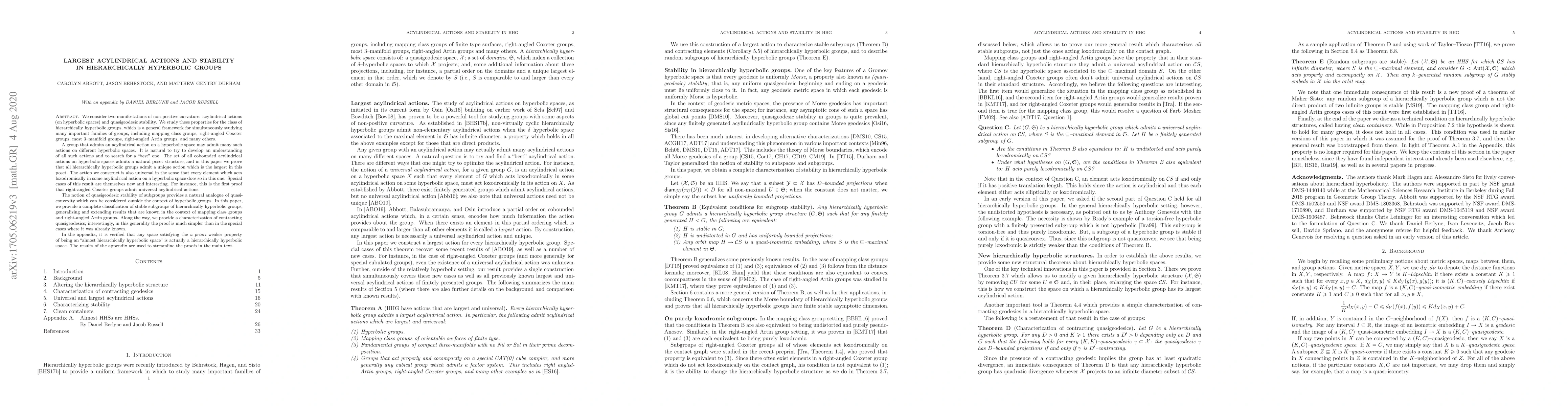 We consider two manifestations of non-positive curvature: acylindrical actions on hyperbolic spaces and quasigeodesic stability. We study these properties for the class of hierarchically hyperbolic groups, which is a general framework for studying many important families of groups, including mapping class groups, right-angled Coxeter and Artin groups, most 3-manifold groups, and many others. A group that admits an acylindrical action on a hyperbolic space may admit many such actions on different hyperbolic spaces, so it is natural to search for a "best" one. The set of all cobounded acylindrical actions on hyperbolic spaces admits a natural poset structure; in this paper we prove that all hierarchically hyperbolic groups admit a unique action which is the largest in this poset. The action we construct is also universal in the sense that every element which acts loxodromically in some acylindrical action on a hyperbolic space does so in this one. Special cases of this result are themselves new and interesting. For instance, this is the first proof that right-angled Coxeter groups admit universal acylindrical actions. The notion of quasigeodesic stability of subgroups provides a natural analogue of quasiconvexity outside the context of hyperbolic groups. We provide a complete classification of stable subgroups of hierarchically hyperbolic groups, generalizing and extending results that are known for mapping class groups and right-angled Artin groups. We also provide a characterization of contracting quasigeodesics; interestingly, in this generality the proof is much simpler than in the special cases where it was already known. In the appendix, it is verified that any space satisfying the a priori weaker property of being an "almost hierarchically hyperbolic space" is actually a hierarchically hyperbolic space. The results of the appendix are used to streamline the proofs in the main text.