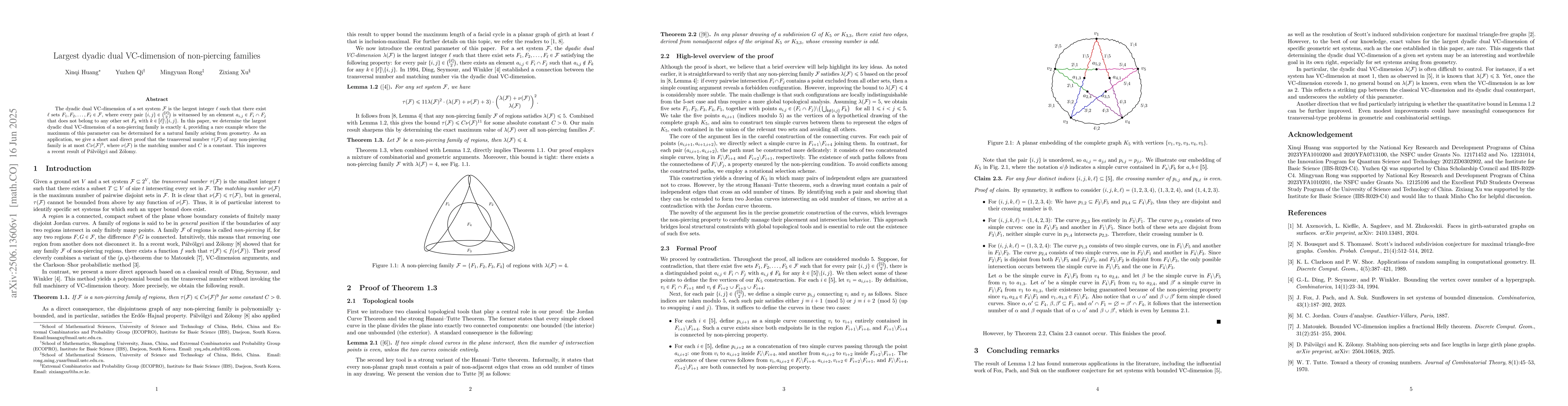 The paper establishes the exact maximum value of the dyadic dual VC-dimension (λ(F)) for all non-piercing families F, which is 4, along with a direct proof linking it to the transversal number.