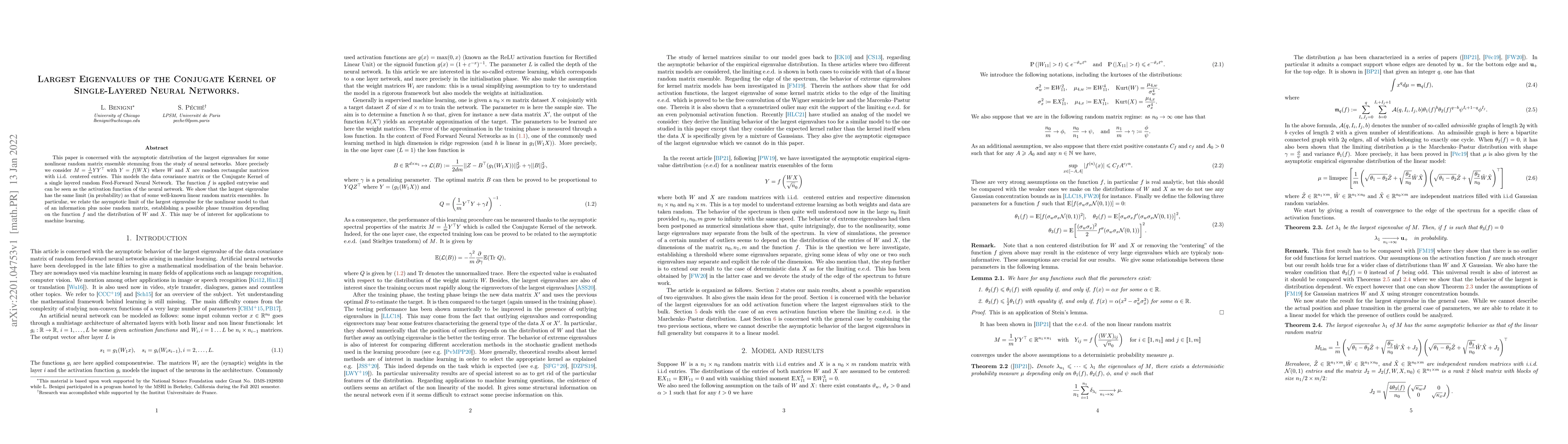 This paper is concerned with the asymptotic distribution of the largest eigenvalues for some nonlinear random matrix ensemble stemming from the study of neural networks. More precisely we consider $M= \frac{1}{m} YY^\top$ with $Y=f(WX)$ where $W$ and $X$ are random rectangular matrices with i.i.d. centered entries. This models the data covariance matrix or the Conjugate Kernel of a single layered random Feed-Forward Neural Network. The function $f$ is applied entrywise and can be seen as the activation function of the neural network. We show that the largest eigenvalue has the same limit (in probability) as that of some well-known linear random matrix ensembles. In particular, we relate the asymptotic limit of the largest eigenvalue for the nonlinear model to that of an information-plus-noise random matrix, establishing a possible phase transition depending on the function $f$ and the distribution of $W$ and $X$. This may be of interest for applications to machine learning.