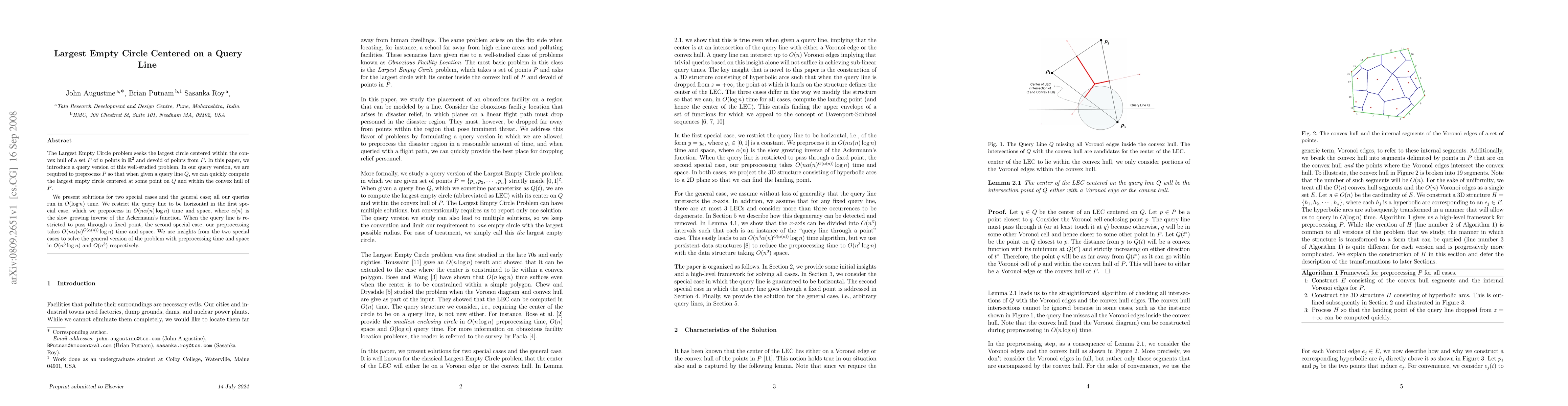 This paper addresses the query version of the Largest Empty Circle problem, focusing on preprocessing a set of points to quickly determine the largest empty circle centered on a given query line within the convex hull. Solutions for two special cases and the general case are presented, with all queries running in $O(\log n)$ time.