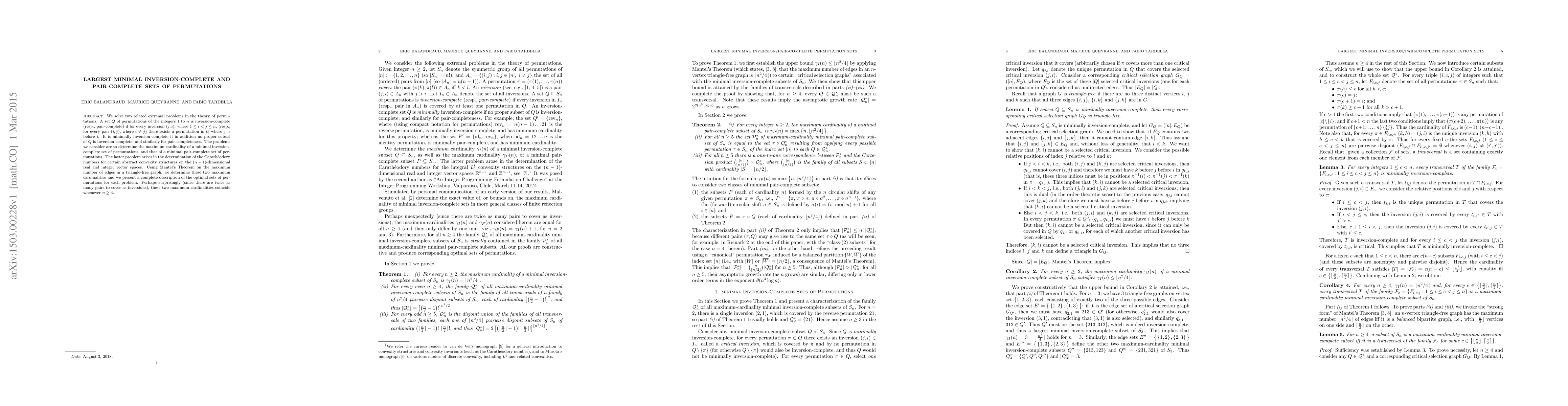 We solve two related extremal problems in the theory of permutations. A set $Q$ of permutations of the integers 1 to $n$ is inversion-complete (resp., pair-complete) if for every inversion $(j,i)$, where $1 \le i \textless{} j \le n$, (resp., for every pair $(i,j)$, where $i\not= j$) there exists a permutation in~$Q$ where $j$ is before~$i$. It is minimally inversion-complete if in addition no proper subset of~$Q$ is inversion-complete; and similarly for pair-completeness. The problems we consider are to determine the maximum cardinality of a minimal inversion-complete set of permutations, and that of a minimal pair-complete set of permutations. The latter problem arises in the determination of the Carath\'eodory numbers for certain abstract convexity structures on the $(n-1)$-dimensional real and integer vector spaces. Using Mantel's Theorem on the maximum number of edges in a triangle-free graph, we determine these two maximum cardinalities and we present a complete description of the optimal sets of permutations for each problem. Perhaps surprisingly (since there are twice as many pairs to cover as inversions), these two maximum cardinalities coincide whenever $n \ge 4$.