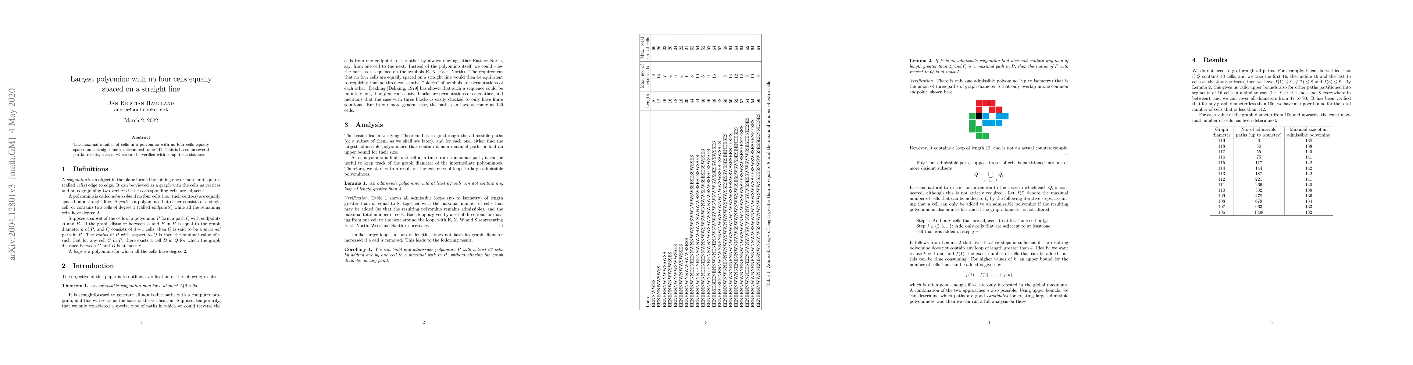 The maximal number of cells in a polyomino with no four cells equally spaced on a straight line is determined to be 142. This is based on several partial results, each of which can be verified with computer assistance.