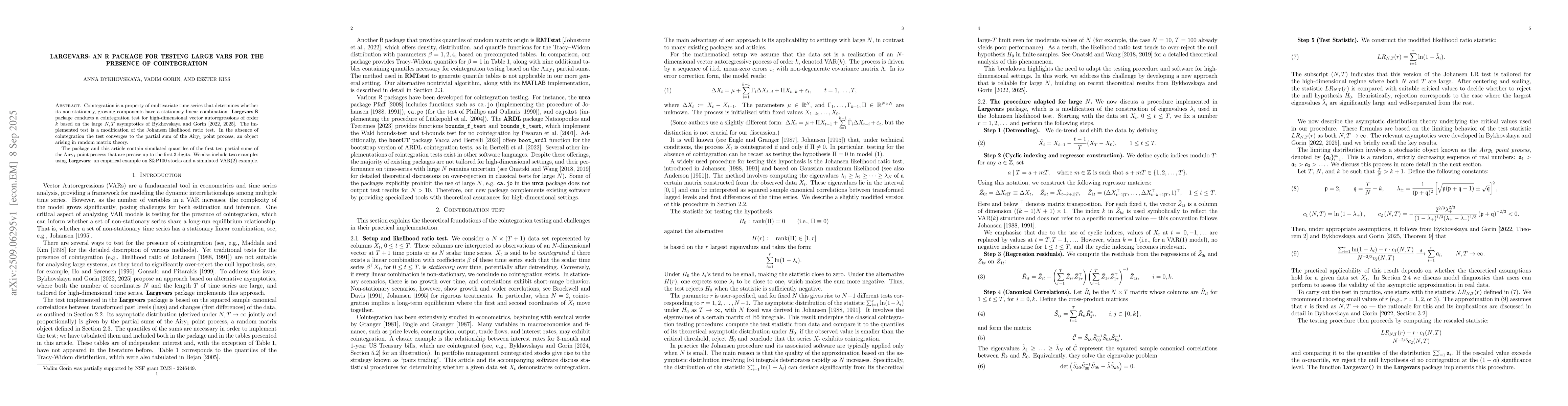 Cointegration is a property of multivariate time series that determines whether its non-stationary, growing components have a stationary linear combination. Largevars R package conducts a cointegration test for high-dimensional vector autoregressions of order k based on the large N, T asymptotics of Bykhovskaya and Gorin (2022, 2025). The implemented test is a modification of the Johansen likelihood ratio test. In the absence of cointegration the test converges to the partial sum of the Airy_1 point process, an object arising in random matrix theory. The package and this article contain simulated quantiles of the first ten partial sums of the Airy_1 point process that are precise up to the first 3 digits. We also include two examples using Largevars: an empirical example on S&P100 stocks and a simulated VAR(2) example.