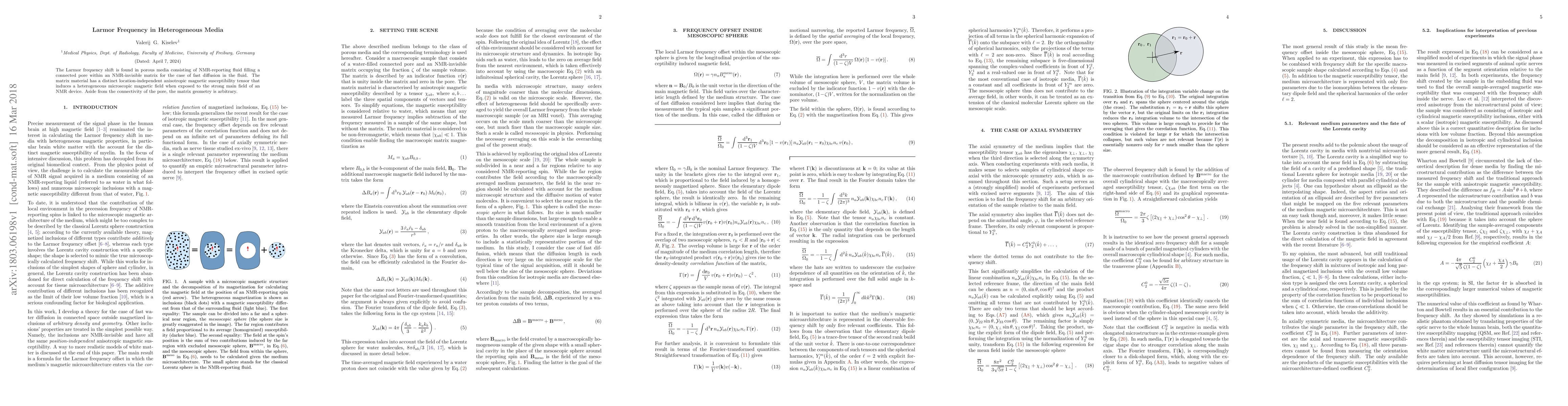 The Larmor frequency shift is found in porous media consisting of NMR-reporting fluid filling a connected pore within an NMR-invisible matrix for the case of fast diffusion in the fluid. The matrix material has a distinct location-independent anisotropic magnetic susceptibility tensor that induces a heterogeneous microscopic magnetic field when exposed to the strong main field of an NMR device. Aside from the connectivity of the pore, the matrix geometry is arbitrary.