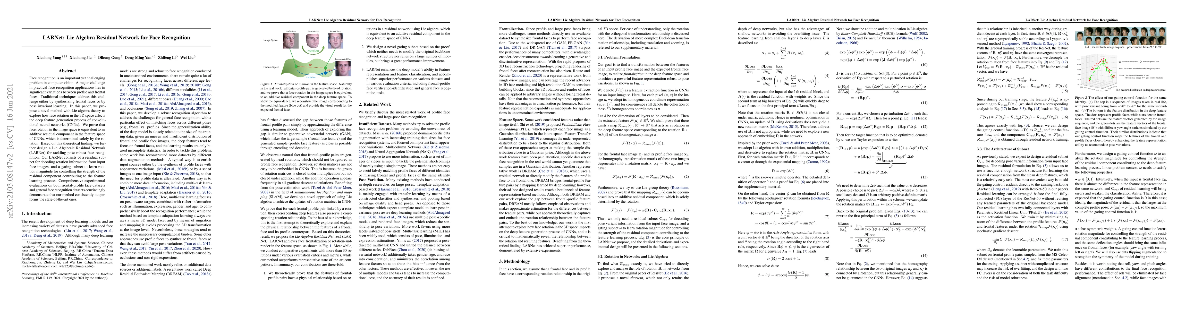 Face recognition is an important yet challenging problem in computer vision. A major challenge in practical face recognition applications lies in significant variations between profile and frontal faces. Traditional techniques address this challenge either by synthesizing frontal faces or by pose invariant learning. In this paper, we propose a novel method with Lie algebra theory to explore how face rotation in the 3D space affects the deep feature generation process of convolutional neural networks (CNNs). We prove that face rotation in the image space is equivalent to an additive residual component in the feature space of CNNs, which is determined solely by the rotation. Based on this theoretical finding, we further design a Lie Algebraic Residual Network (LARNet) for tackling pose robust face recognition. Our LARNet consists of a residual subnet for decoding rotation information from input face images, and a gating subnet to learn rotation magnitude for controlling the strength of the residual component contributing to the feature learning process. Comprehensive experimental evaluations on both frontal-profile face datasets and general face recognition datasets convincingly demonstrate that our method consistently outperforms the state-of-the-art ones.