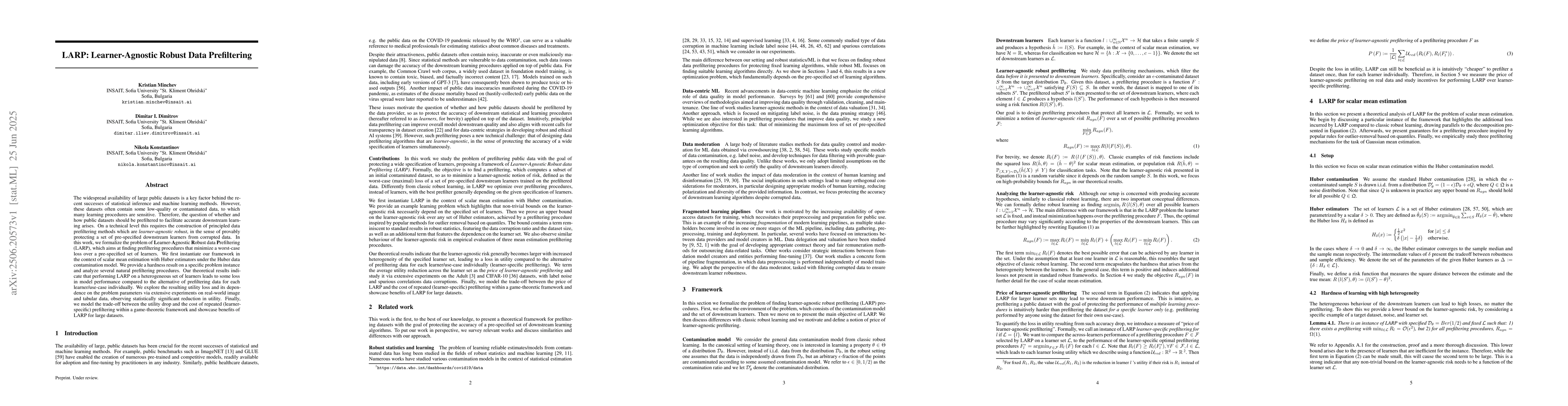 The widespread availability of large public datasets is a key factor behind the recent successes of statistical inference and machine learning methods. However, these datasets often contain some low-quality or contaminated data, to which many learning procedures are sensitive. Therefore, the question of whether and how public datasets should be prefiltered to facilitate accurate downstream learning arises. On a technical level this requires the construction of principled data prefiltering methods which are learner-agnostic robust, in the sense of provably protecting a set of pre-specified downstream learners from corrupted data. In this work, we formalize the problem of Learner-Agnostic Robust data Prefiltering (LARP), which aims at finding prefiltering procedures that minimize a worst-case loss over a pre-specified set of learners. We first instantiate our framework in the context of scalar mean estimation with Huber estimators under the Huber data contamination model. We provide a hardness result on a specific problem instance and analyze several natural prefiltering procedures. Our theoretical results indicate that performing LARP on a heterogeneous set of learners leads to some loss in model performance compared to the alternative of prefiltering data for each learner/use-case individually. We explore the resulting utility loss and its dependence on the problem parameters via extensive experiments on real-world image and tabular data, observing statistically significant reduction in utility. Finally, we model the trade-off between the utility drop and the cost of repeated (learner-specific) prefiltering within a game-theoretic framework and showcase benefits of LARP for large datasets.