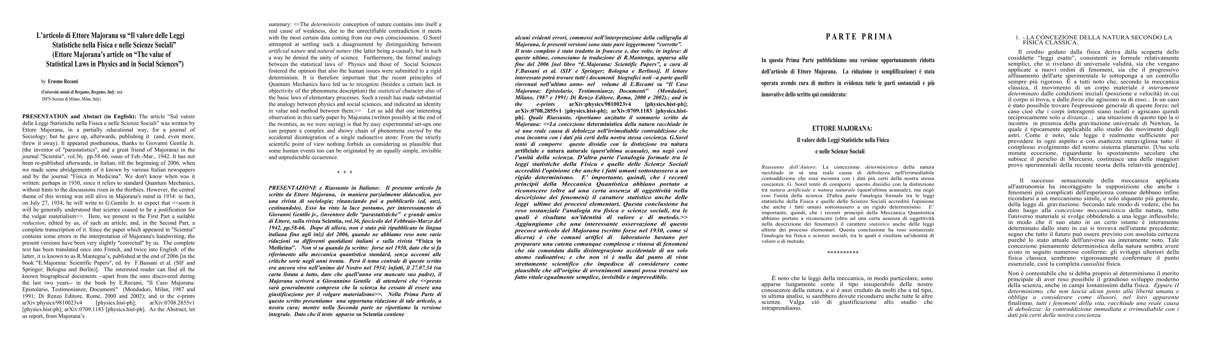 Ettore Majorana authored an article on the relevance of statistical laws in both physics and social sciences, which he intended for a sociology journal but never published. The work was posthumously released in 1942 and later abridged in 2006, featuring corrections to earlier misinterpretations of his handwriting.